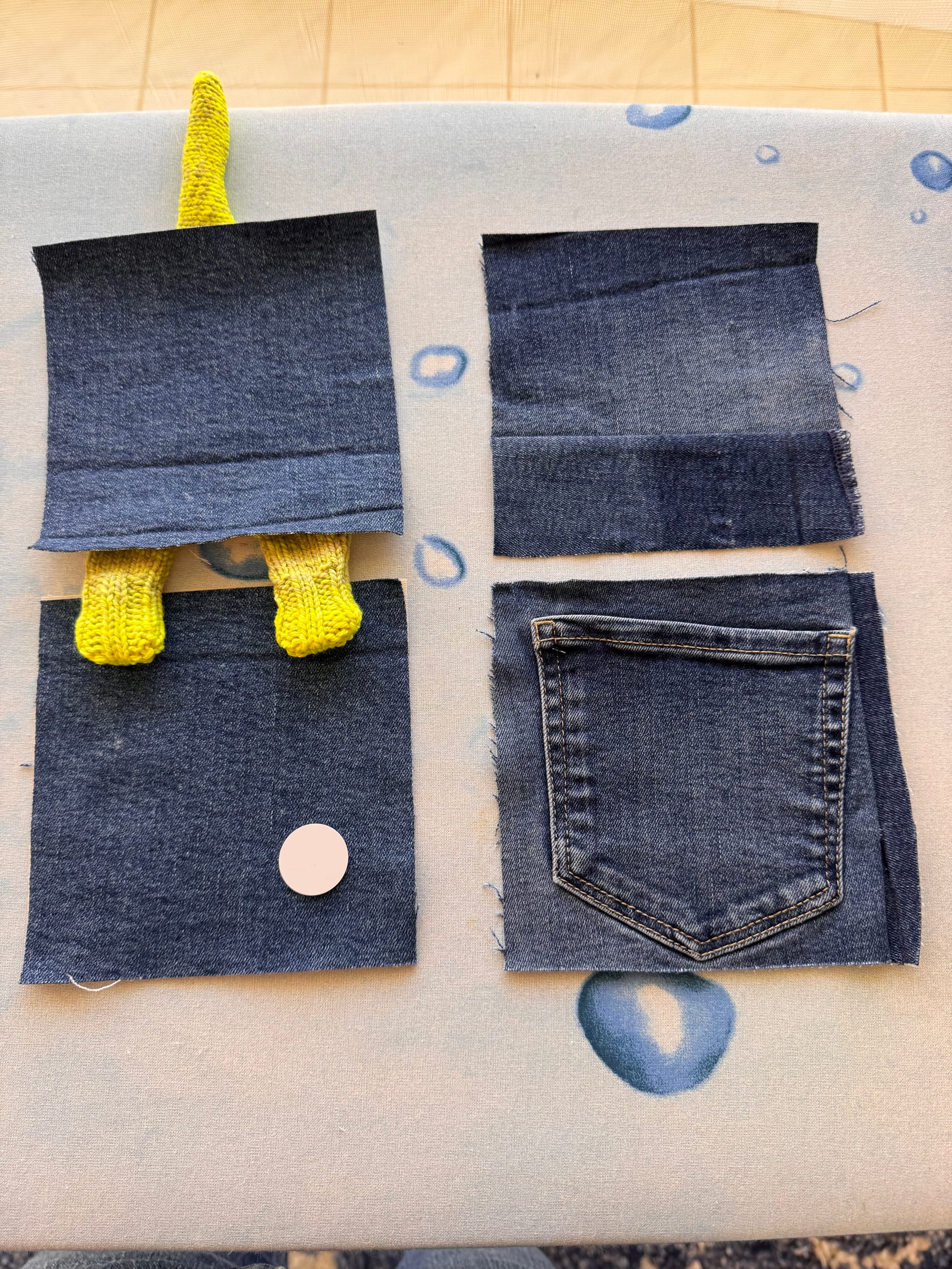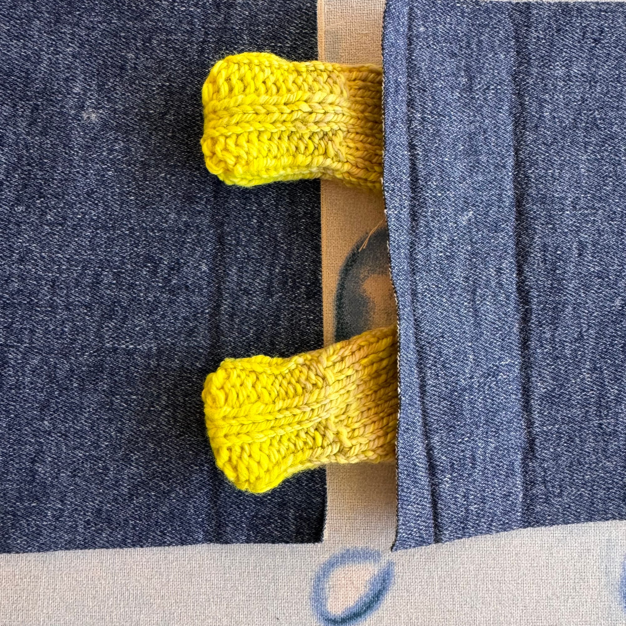 We ended up piecing the denim for the head because the scraps we were using were not quite large enough. The feet and tail are made of a half-finished, hand knitted sock. The neon yellow yarn used was the absolutely incredible Bad Egg color from Spin Cycle Yarns. We're running low on this yarn, and now I'm realizing we must order some more.