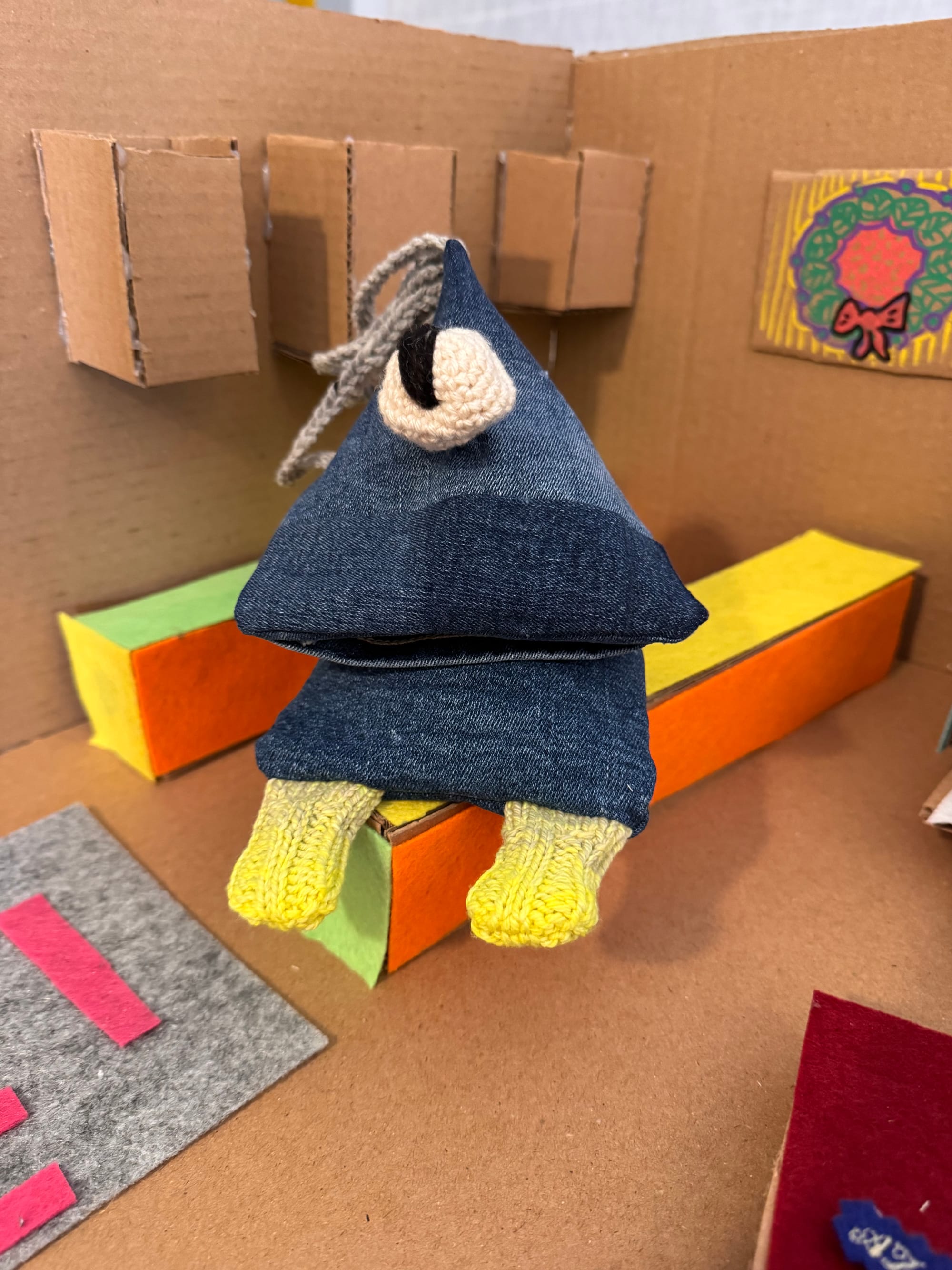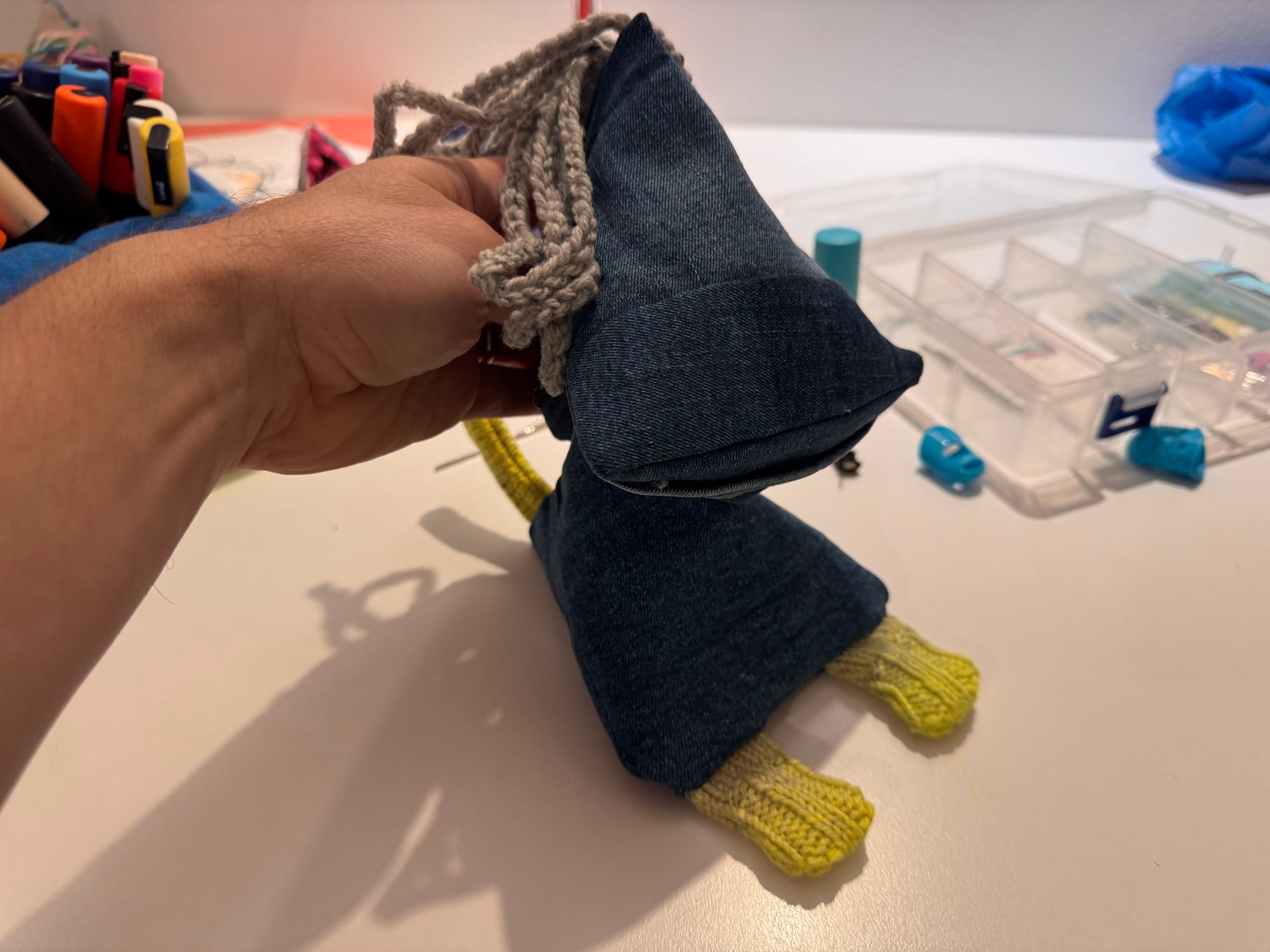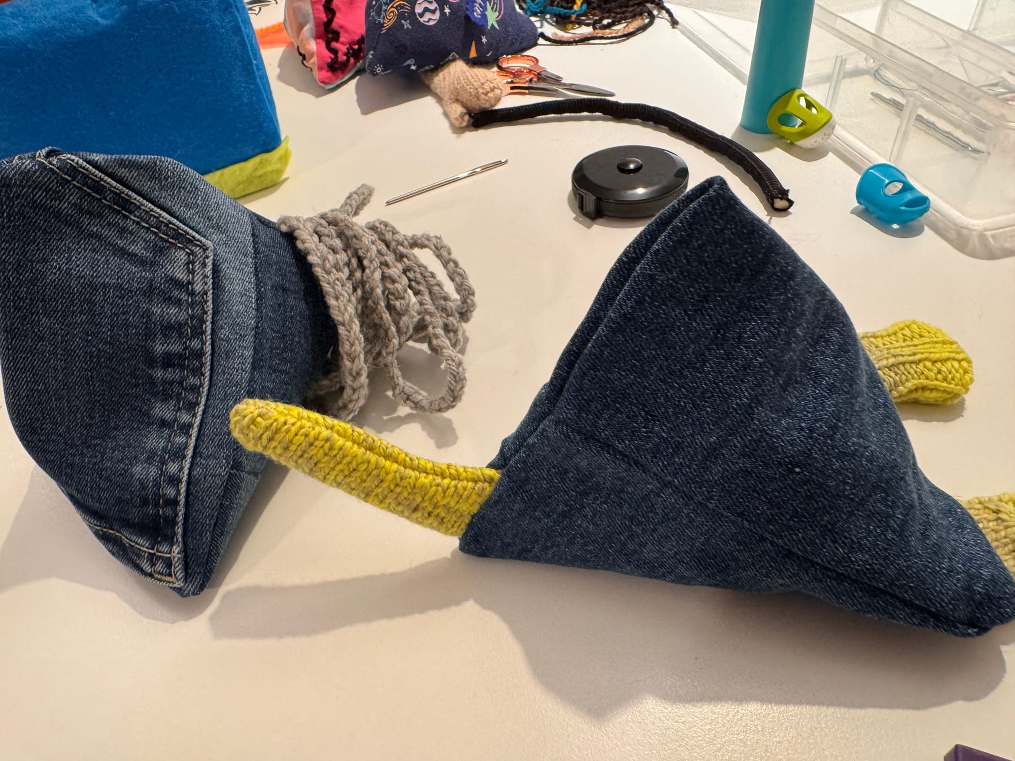 We wanted to make another monochromatic Azaboo. Denim is super fun to work with. We chose the neon yellow accents for the feet and tail. They really pop against the deep denim blue. For the hair, we chose a gray wool yarn, but we didn't have much of it, so we used what we had, and it turned out to be perfectly fine.
