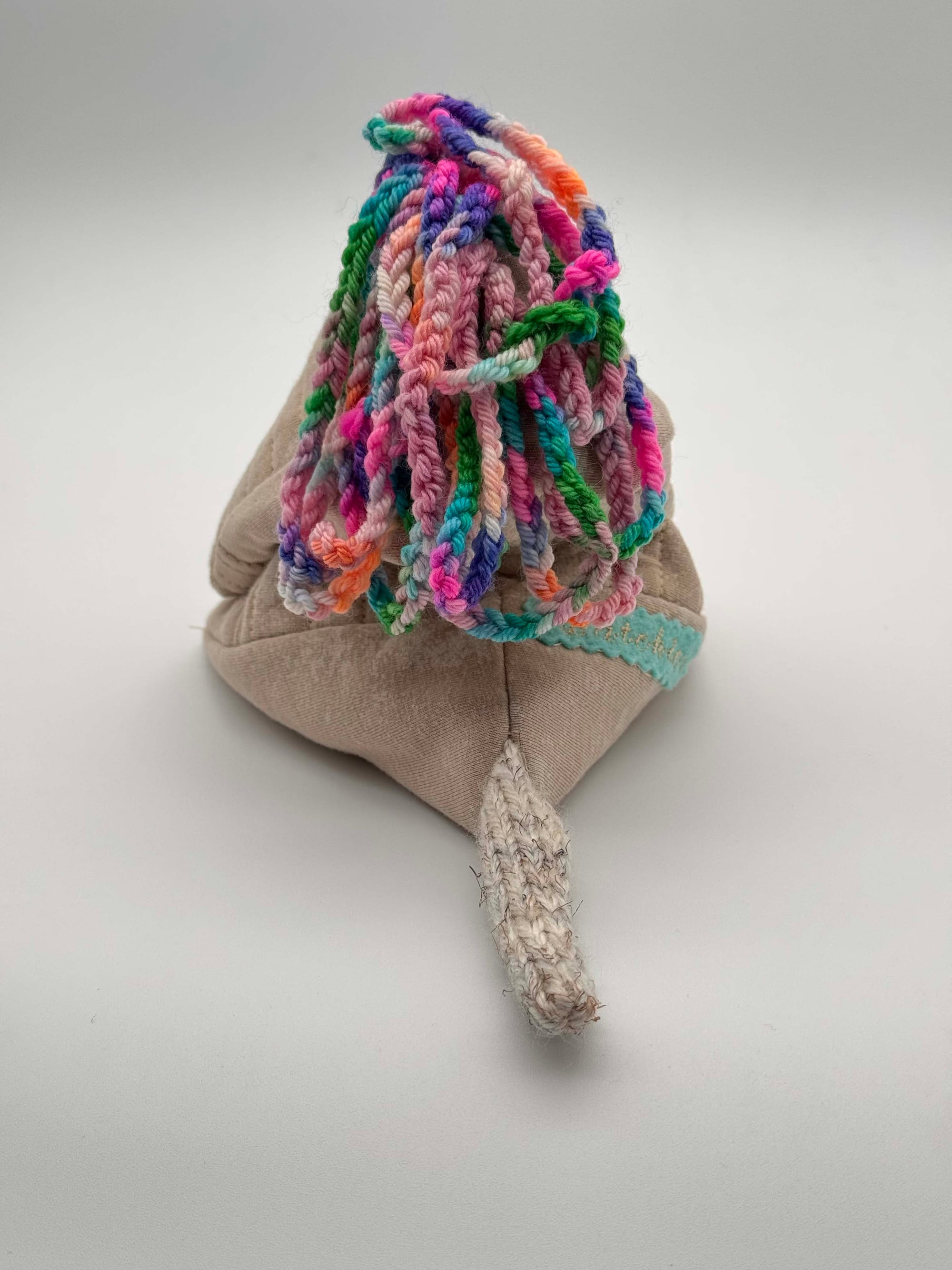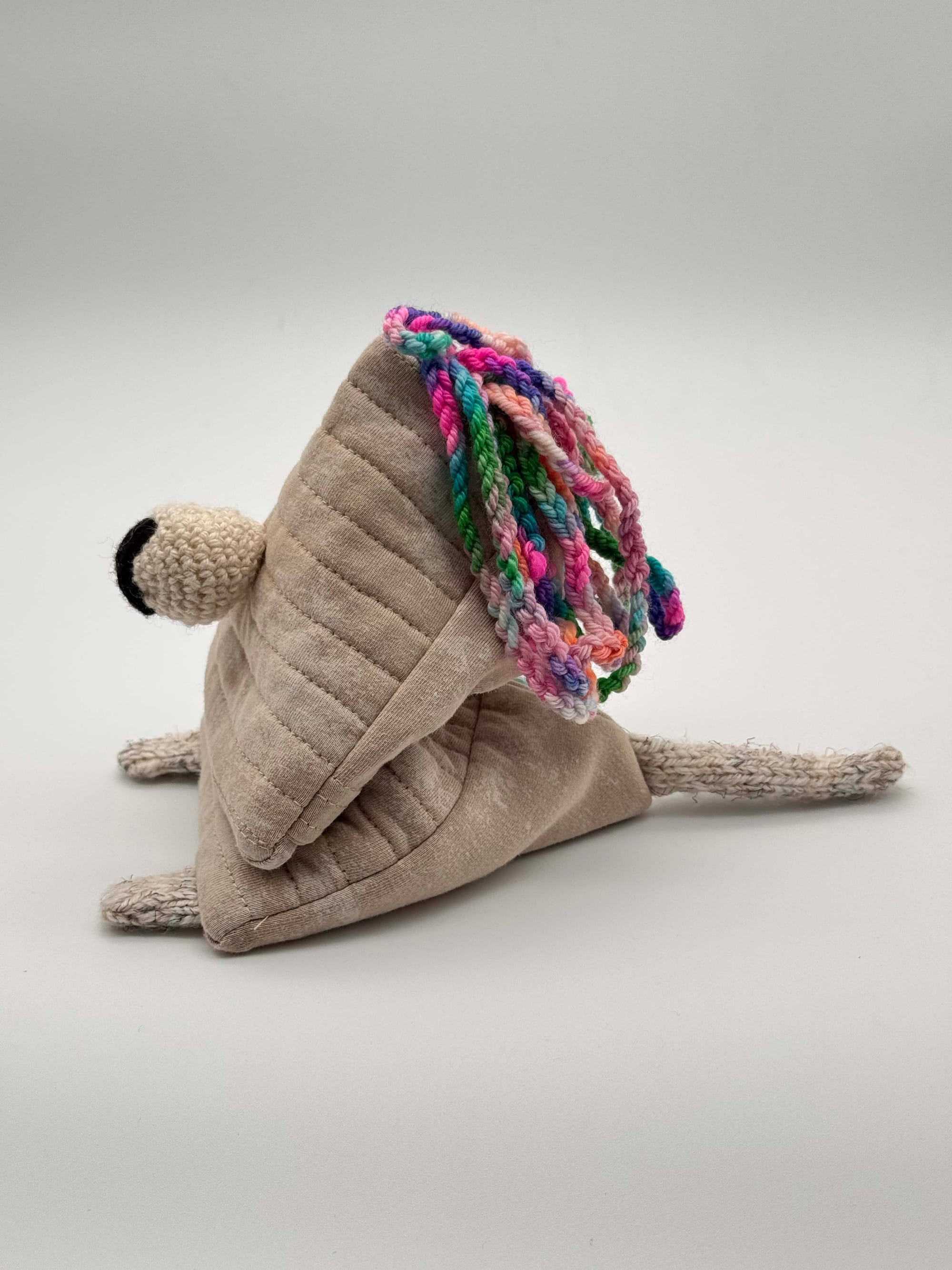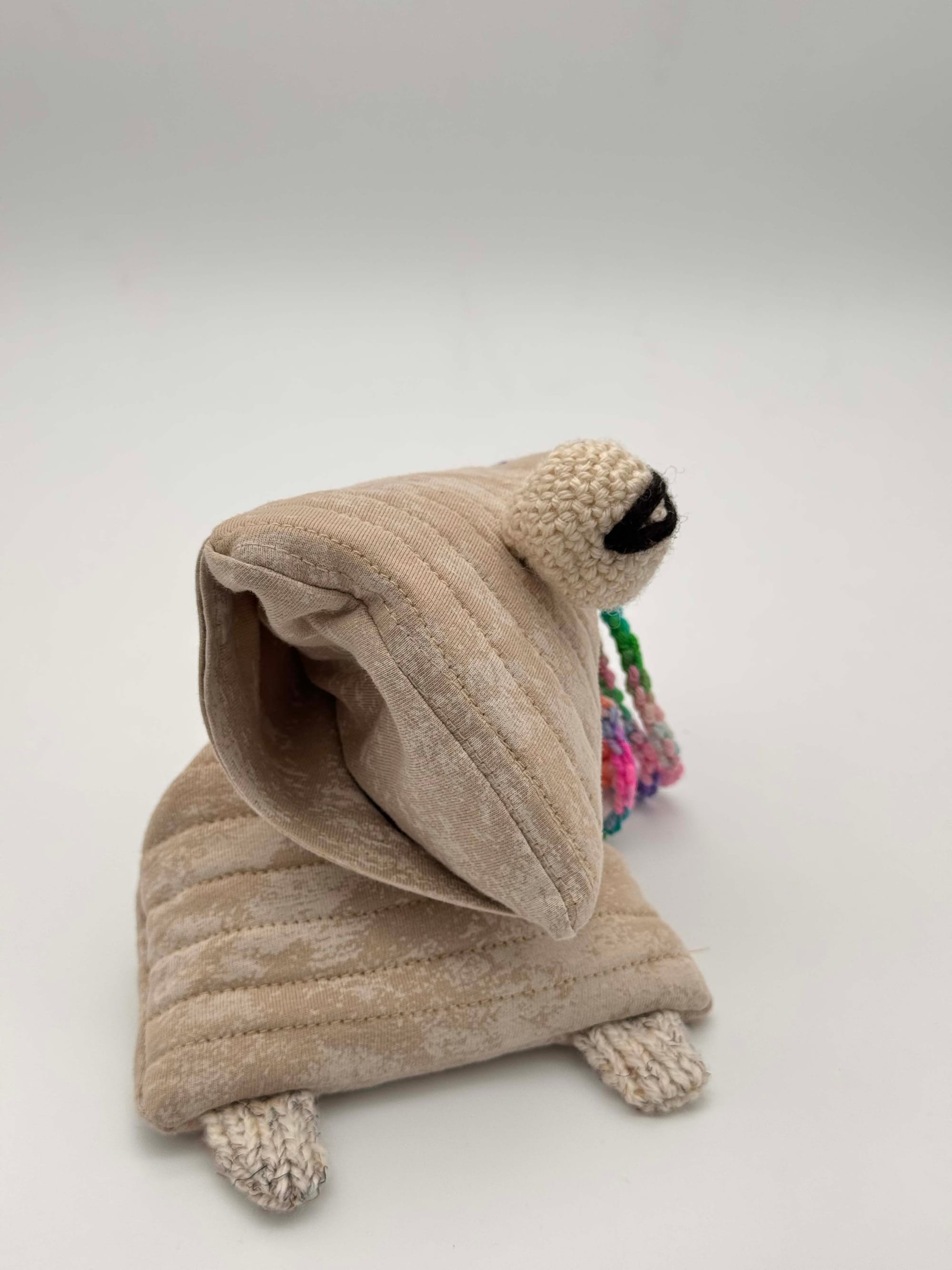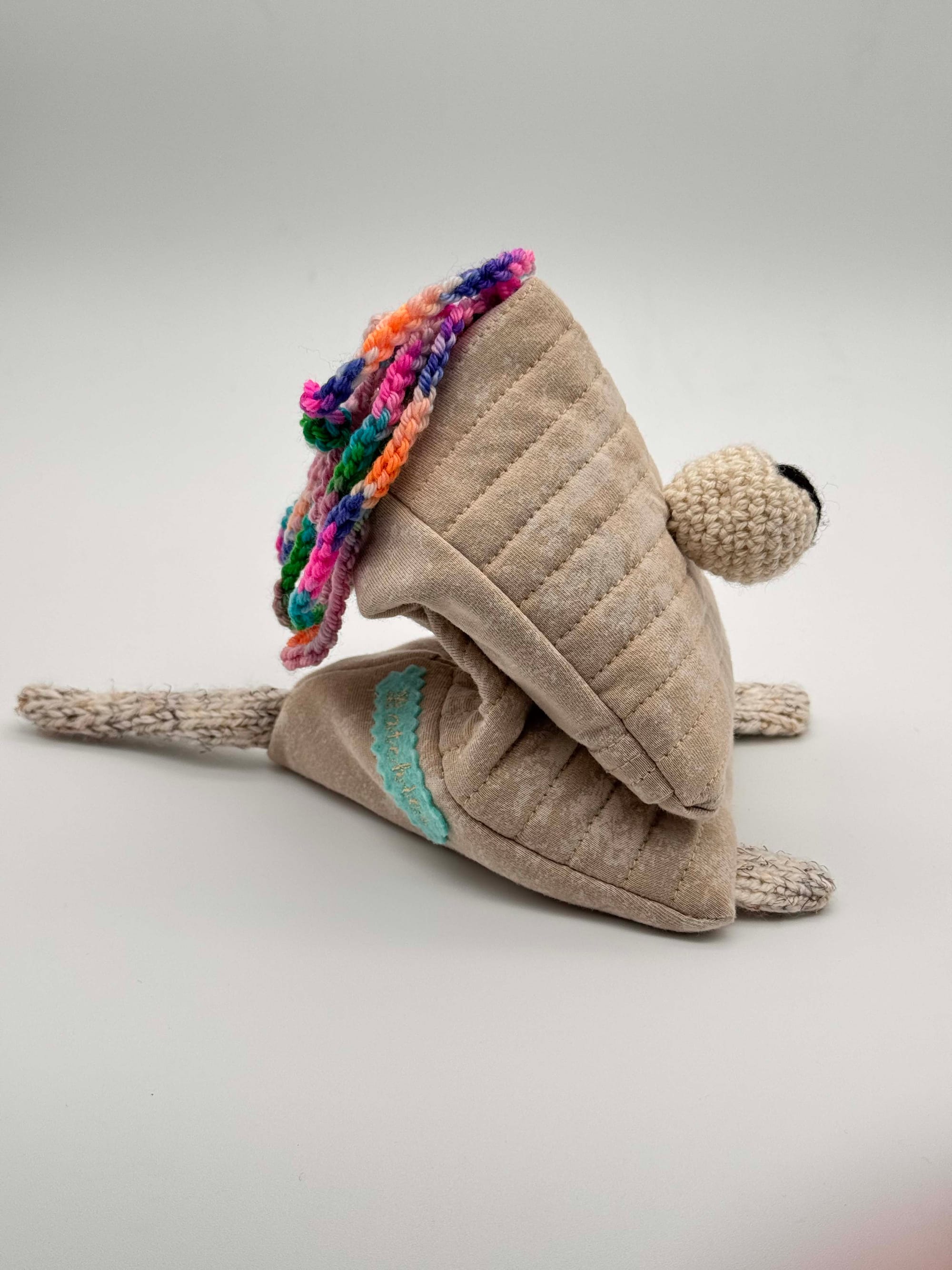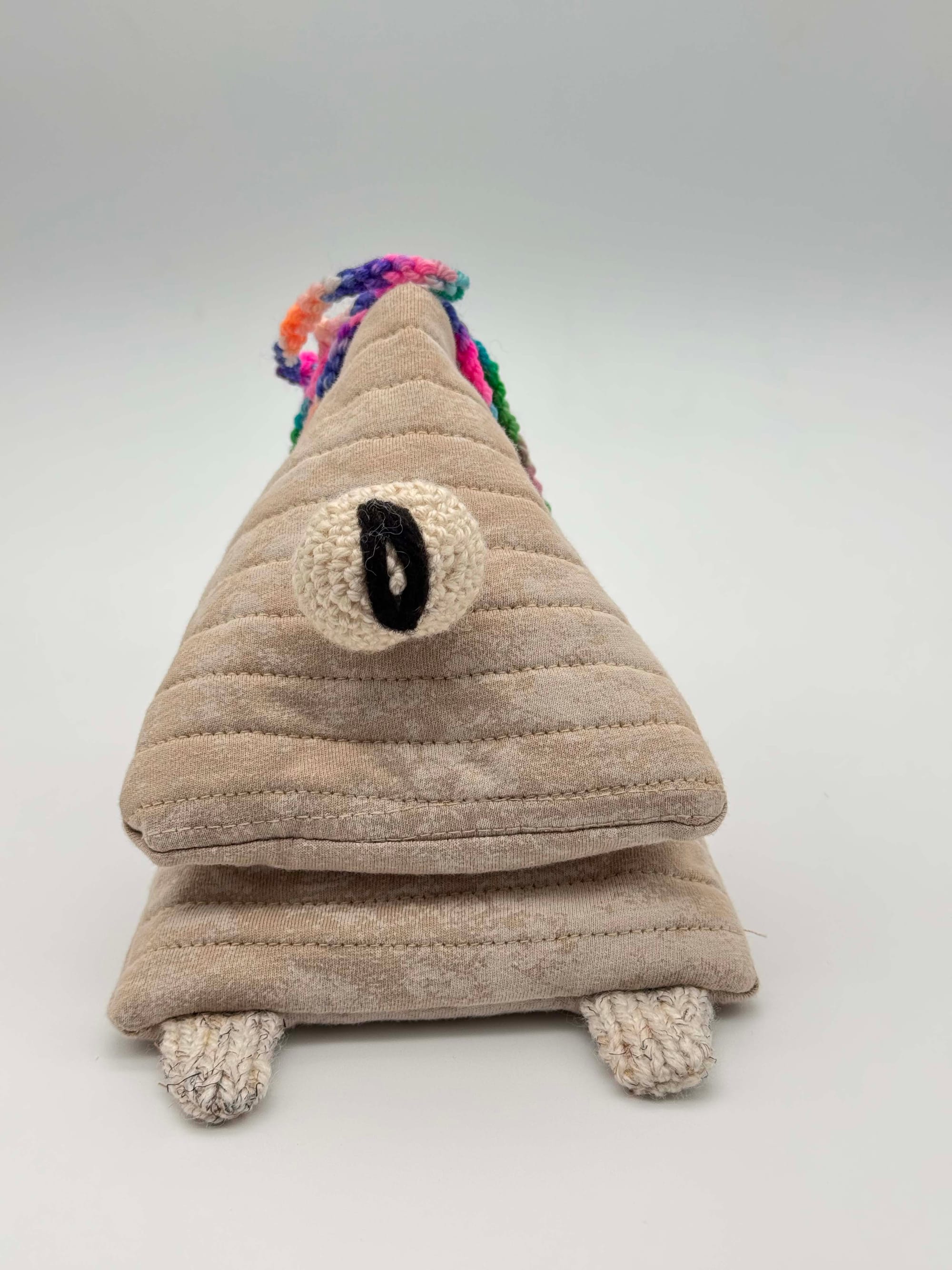 This is the beige Azaboo. The fabric from the T-shirt was a bit unstructured, so we added layers of quilting. The quilt sandwich creates a nice soft structure with the top piece, the cotton batting, and muslin backing. The feet and tail are made out of a knitted scrap that was sewn together. The eye and hair was crocheted, one of our favorite techniques.