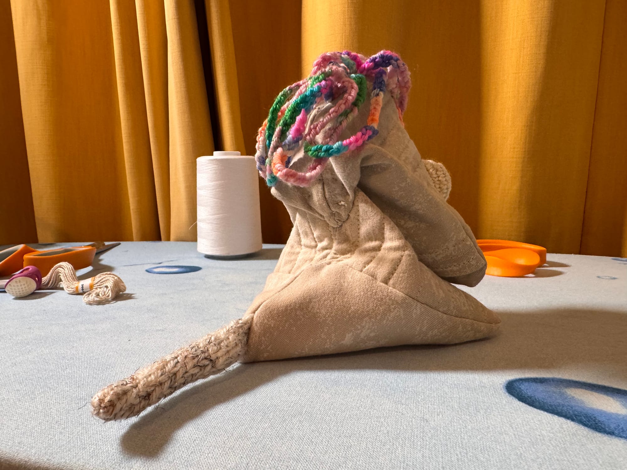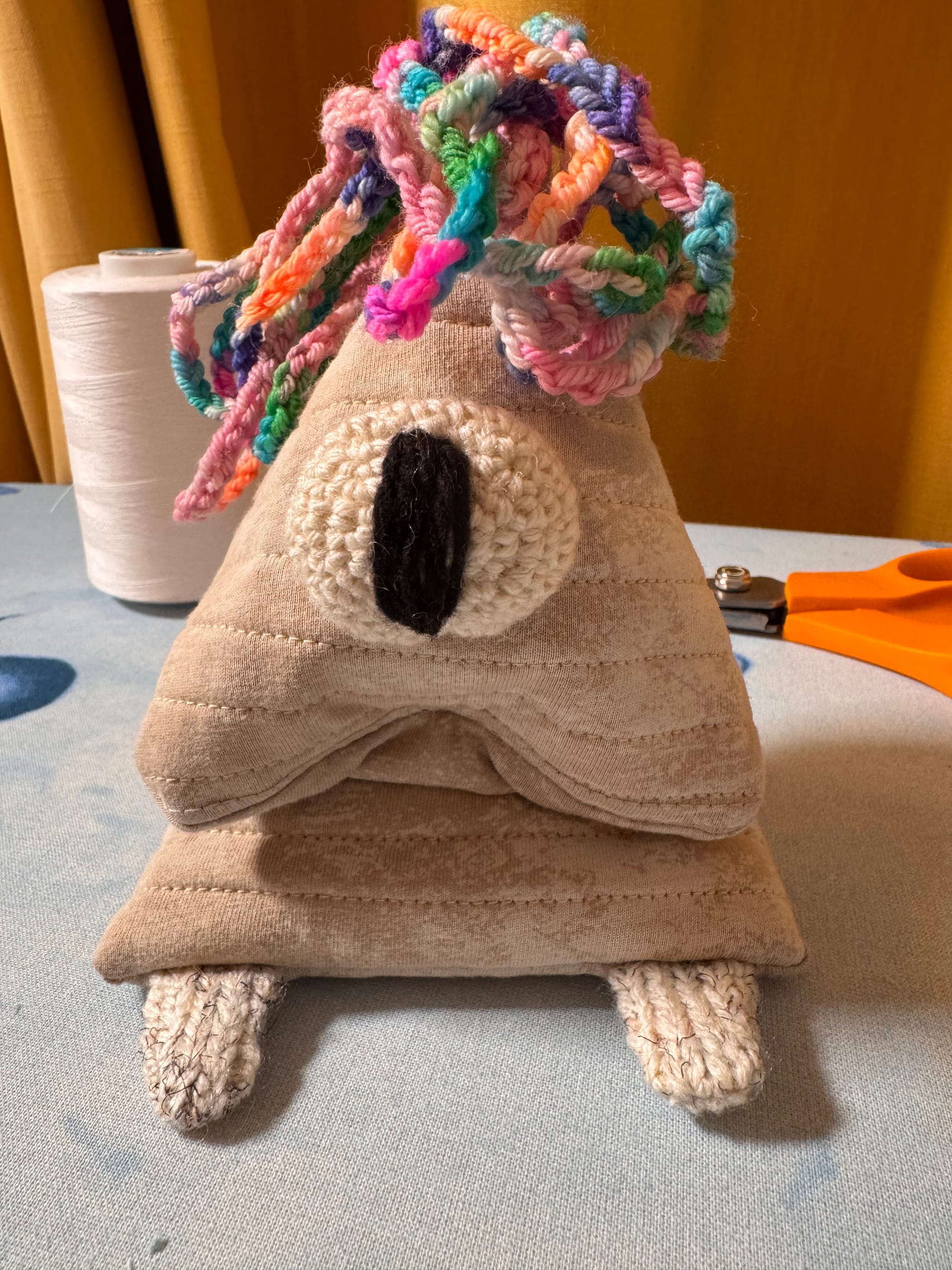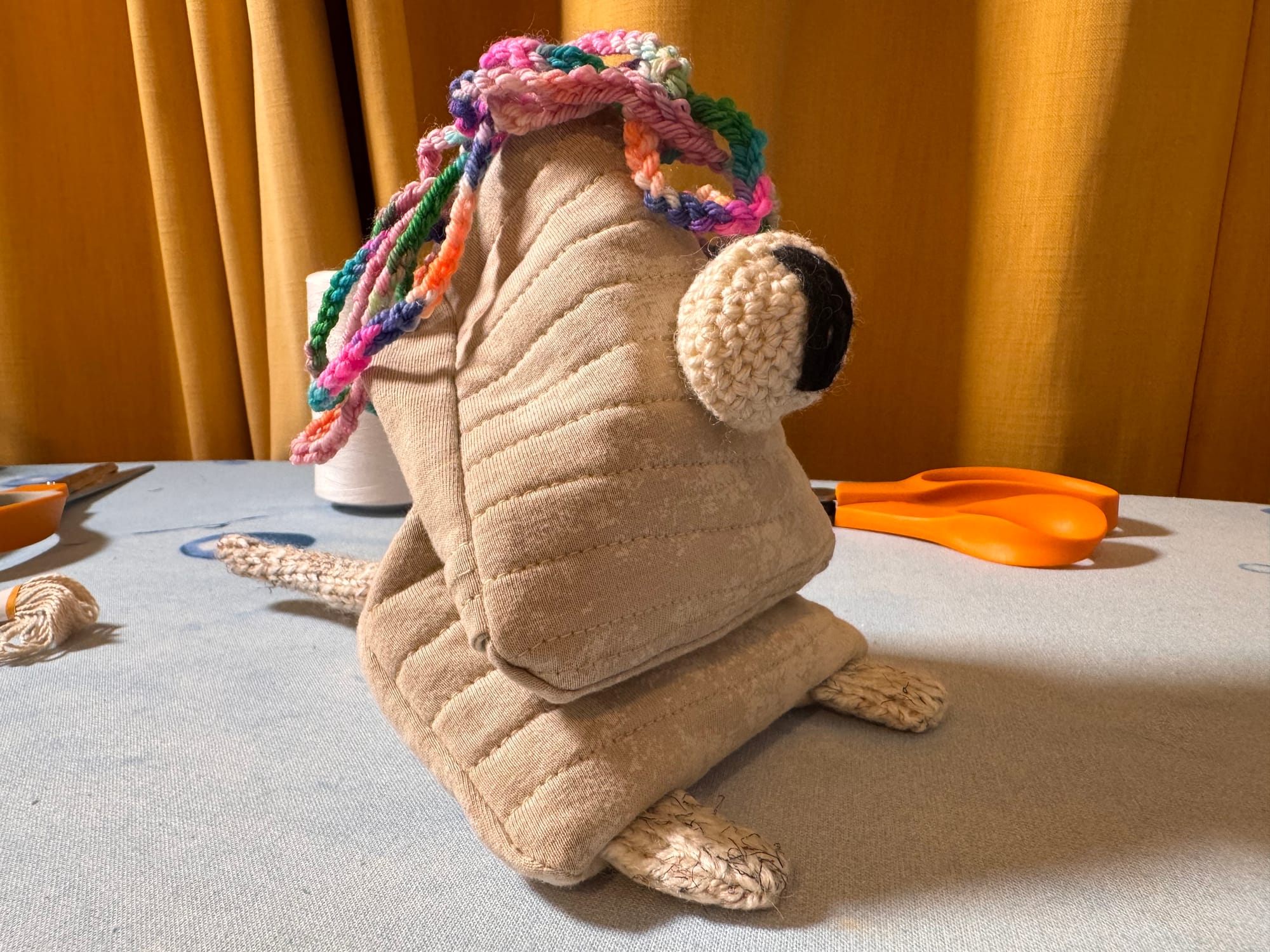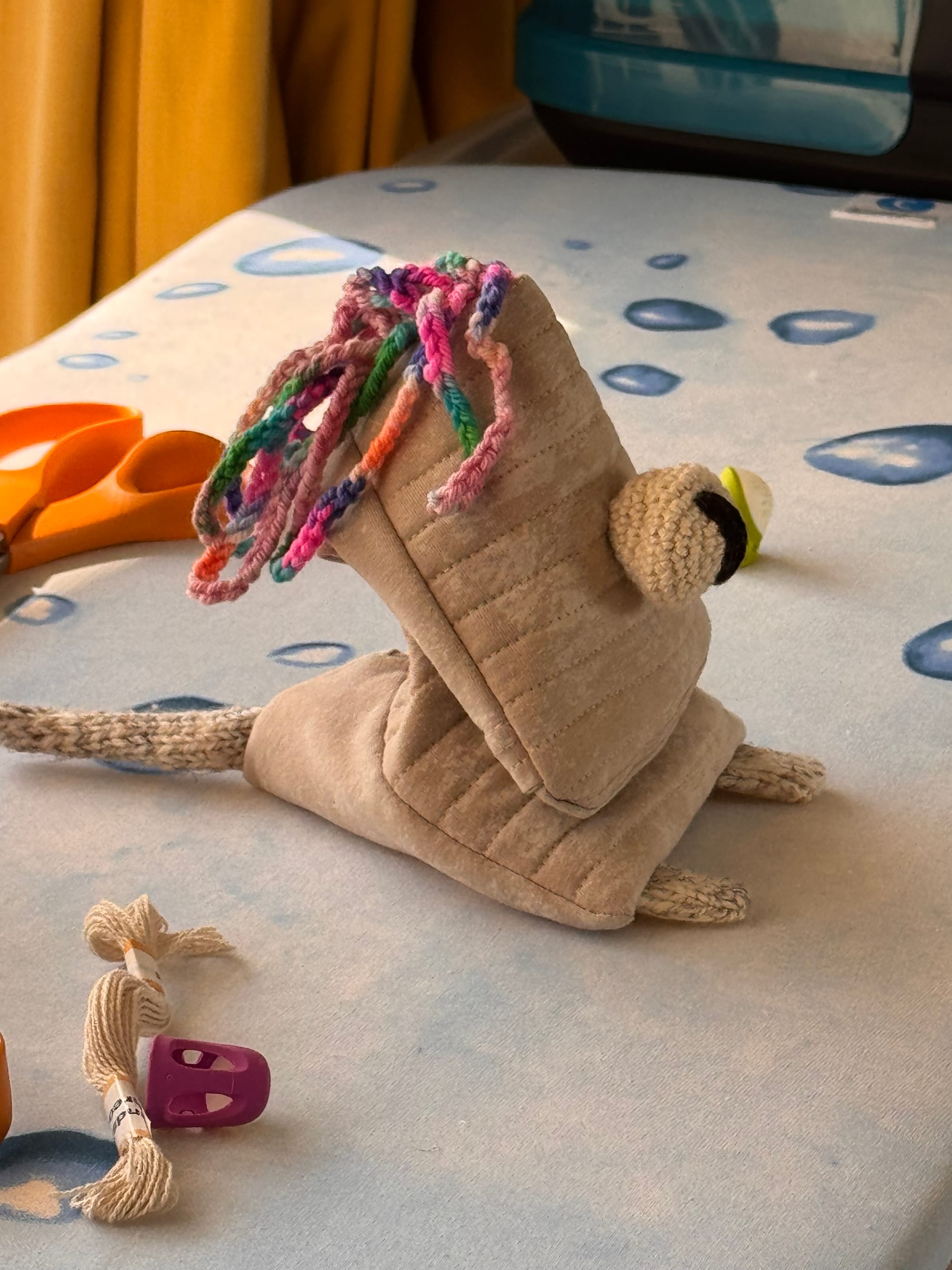 This is the beige Azaboo. The fabric from the T-shirt was a bit unstructured, so we added layers of quilting. The quilt sandwich creates a nice soft structure with the top piece, the cotton batting, and muslin backing. The feet and tail are made out of a knitted scrap that was sewn together. The eye and hair was crocheted, one of our favorite techniques.