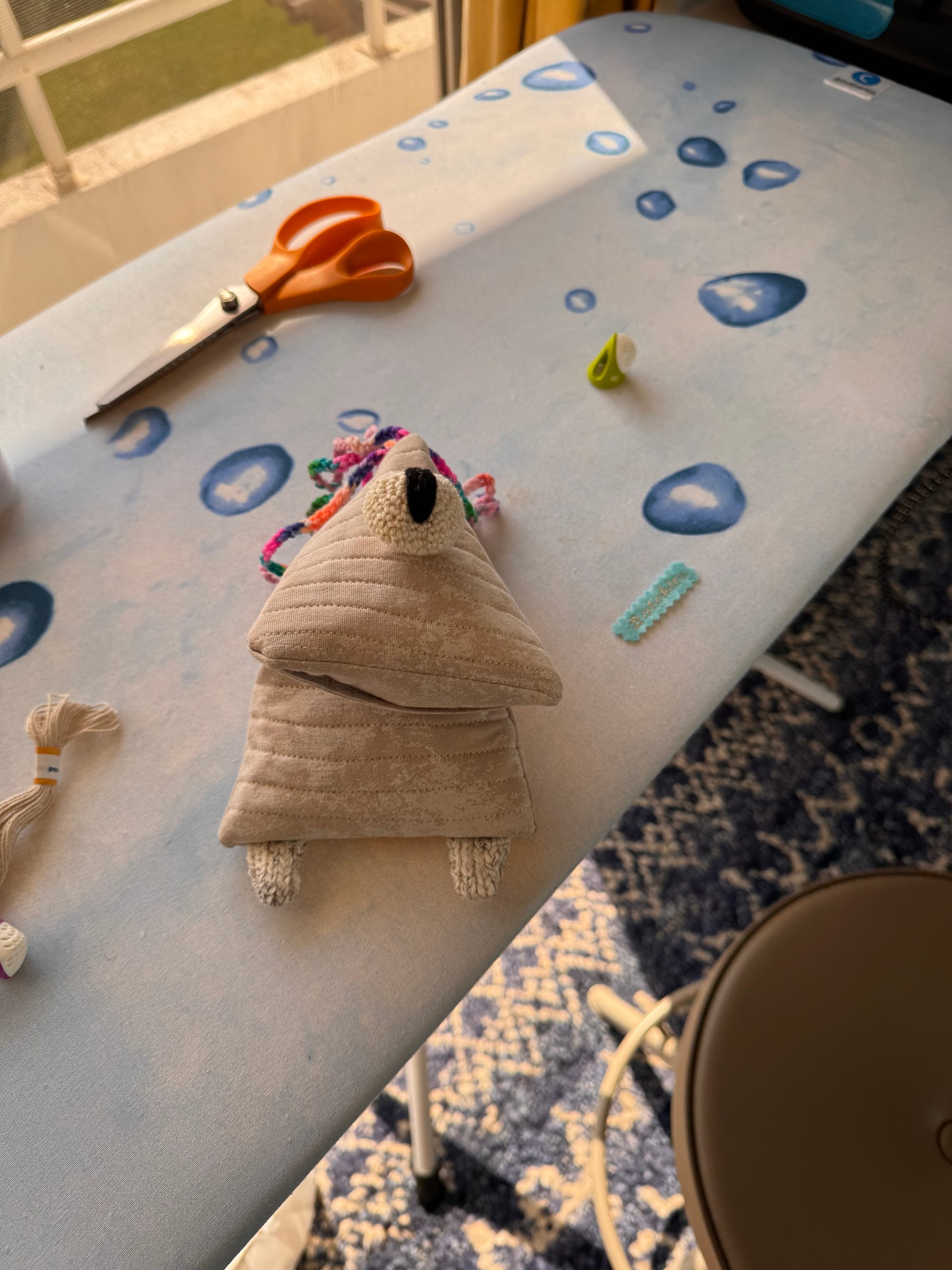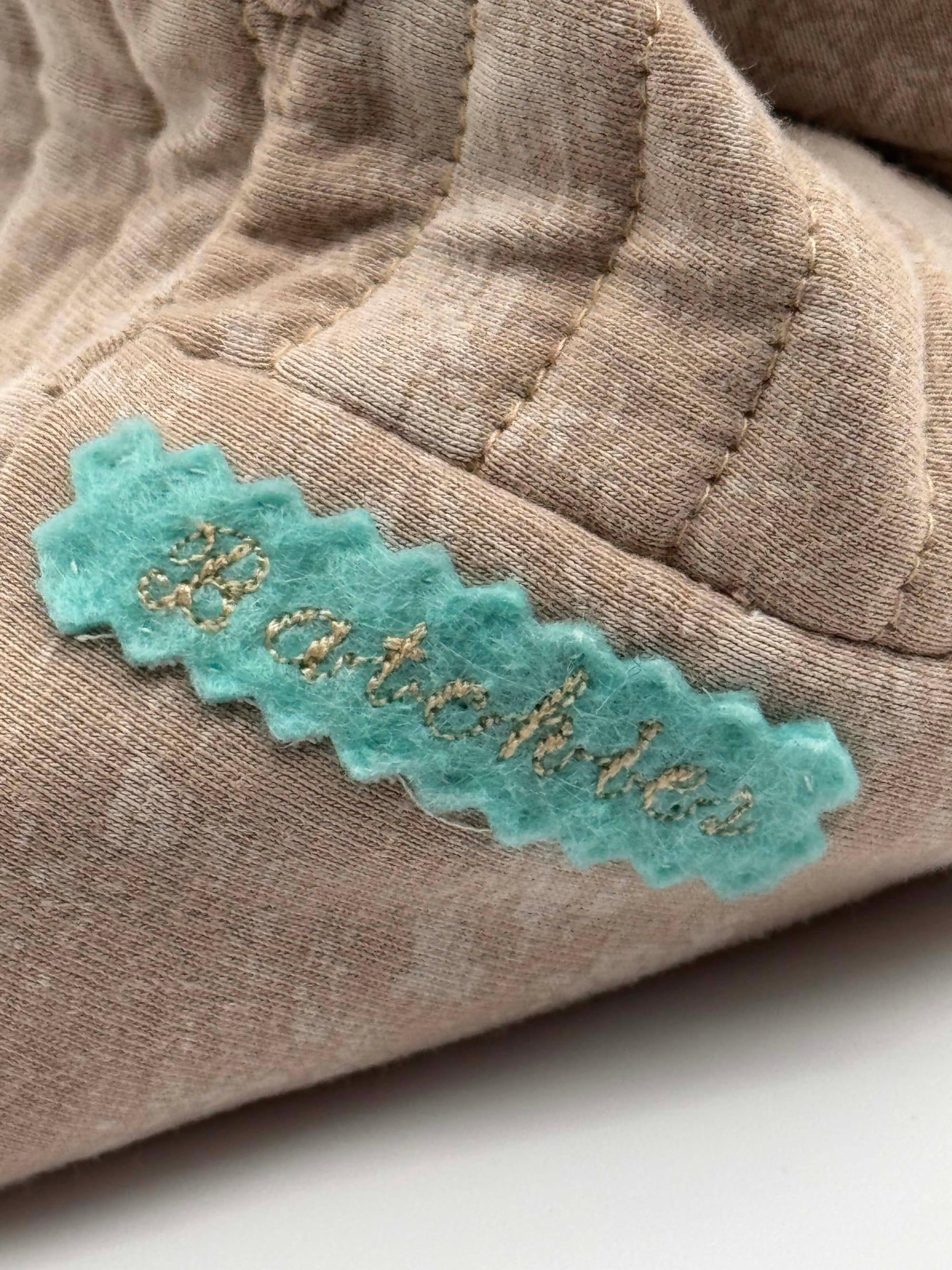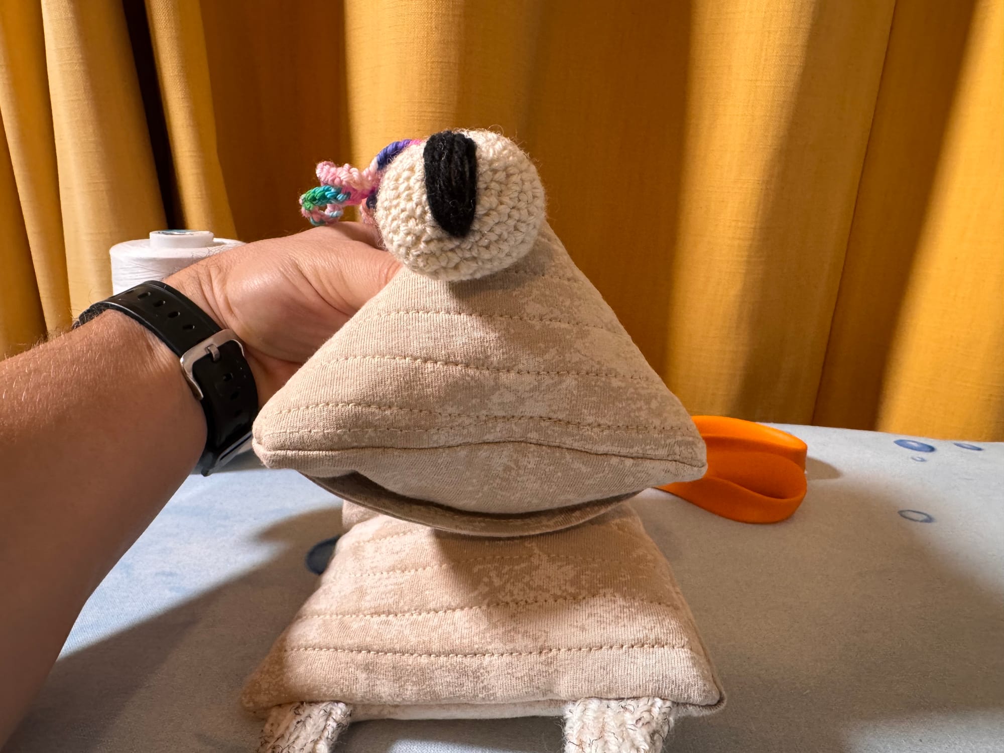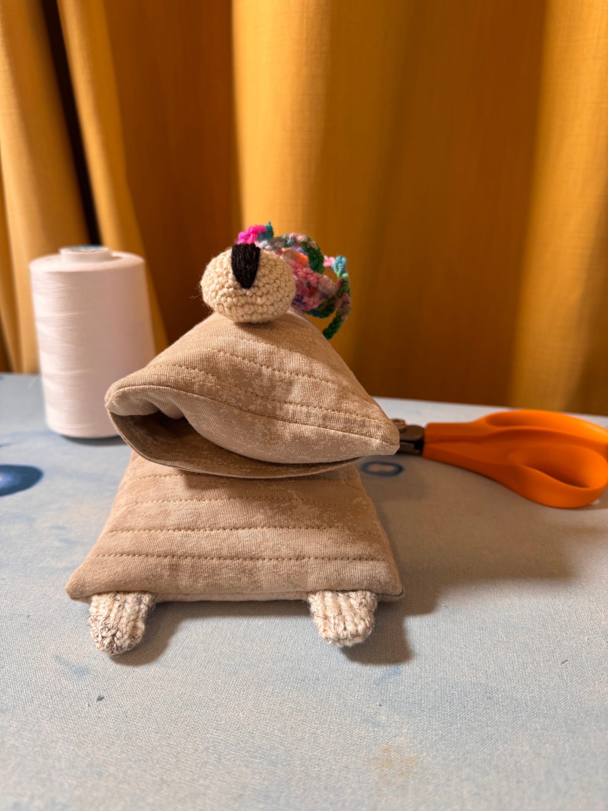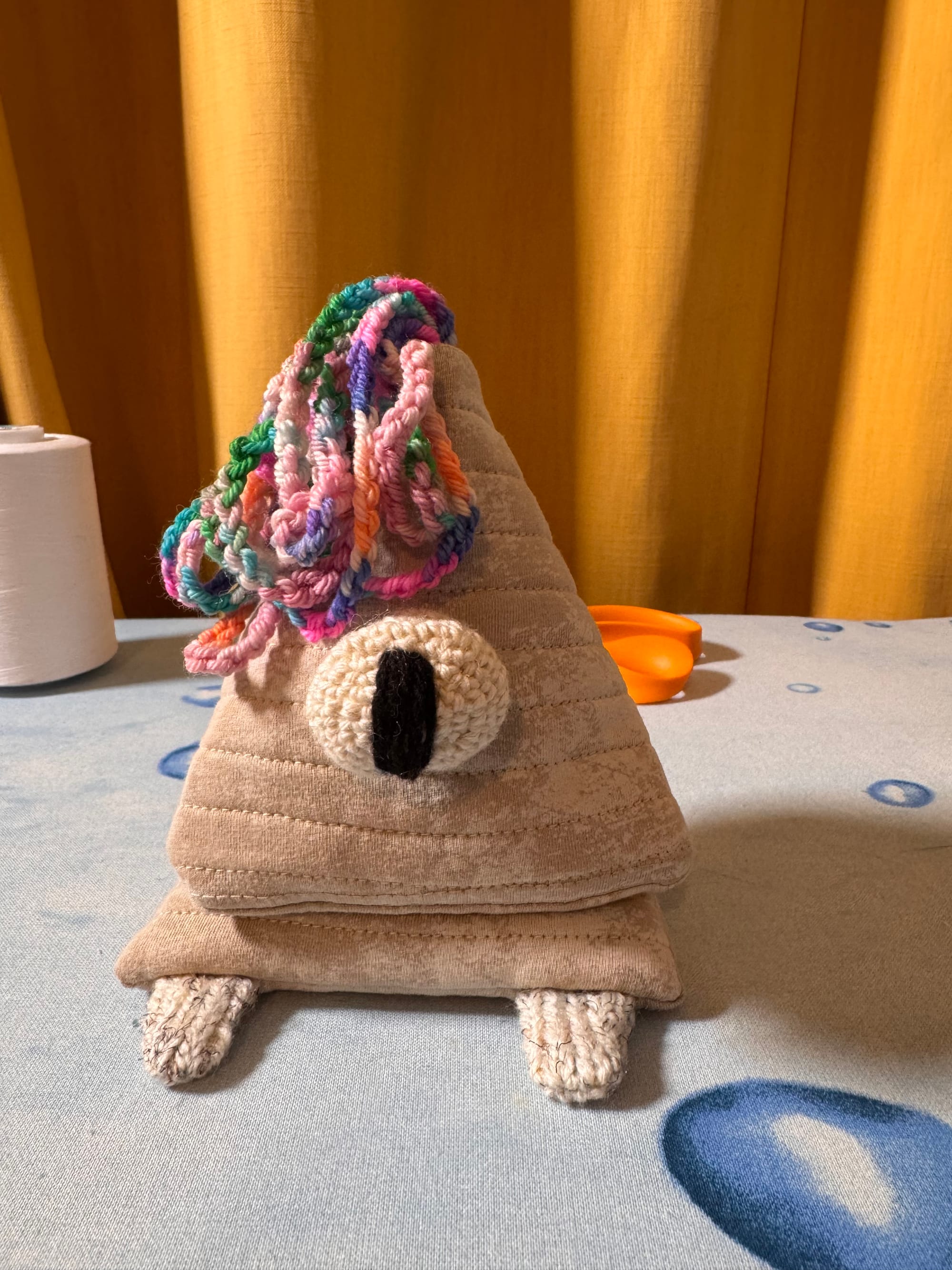 This is the beige Azaboo. The fabric from the T-shirt was a bit unstructured, so we added layers of quilting. The quilt sandwich creates a nice soft structure with the top piece, the cotton batting, and muslin backing. The feet and tail are made out of a knitted scrap that was sewn together. The eye and hair was crocheted, one of our favorite techniques.