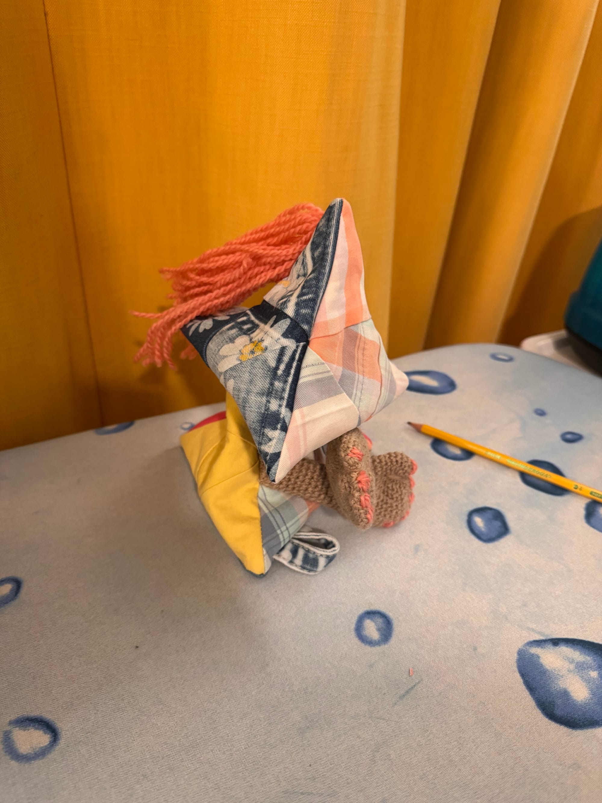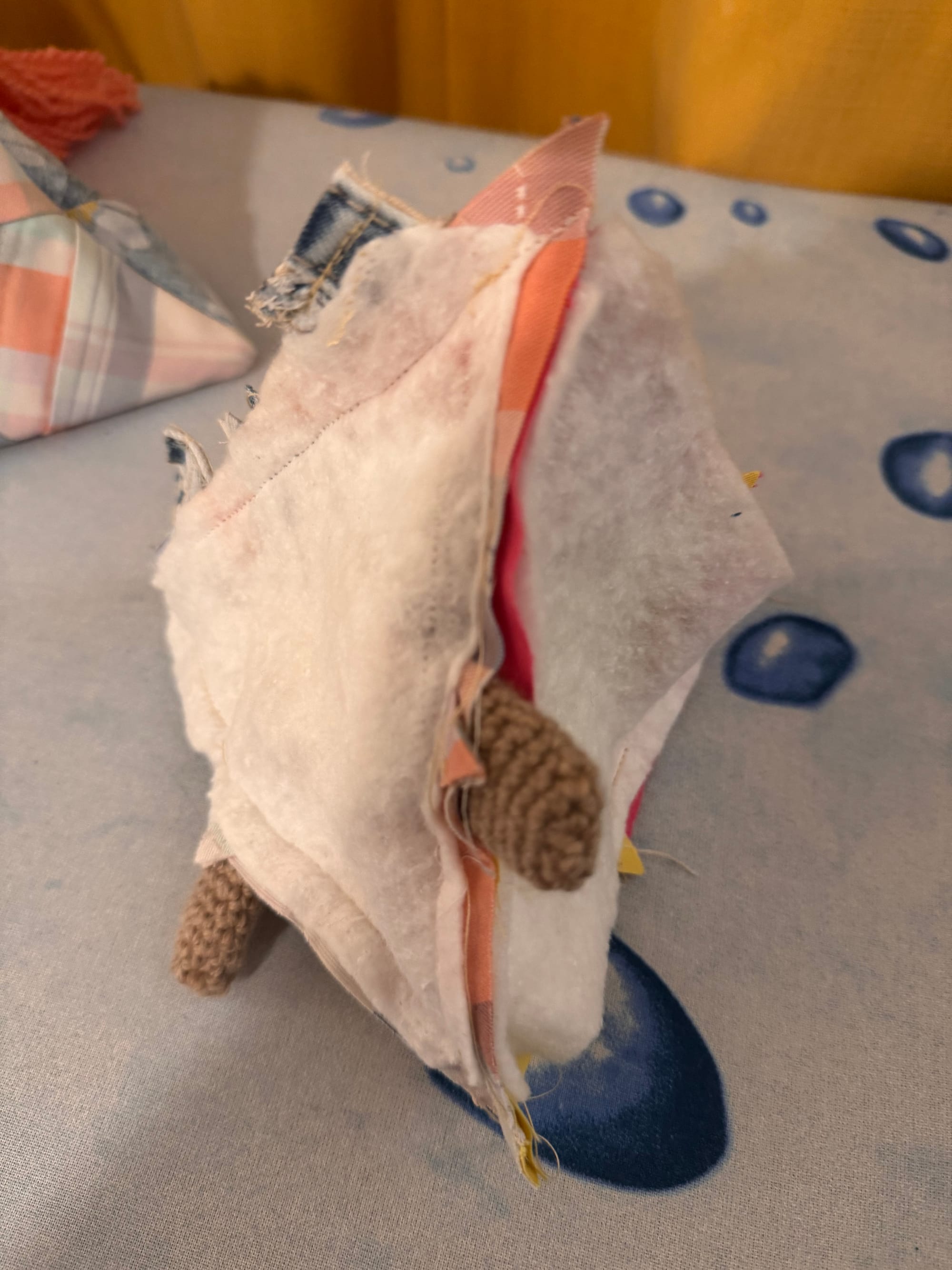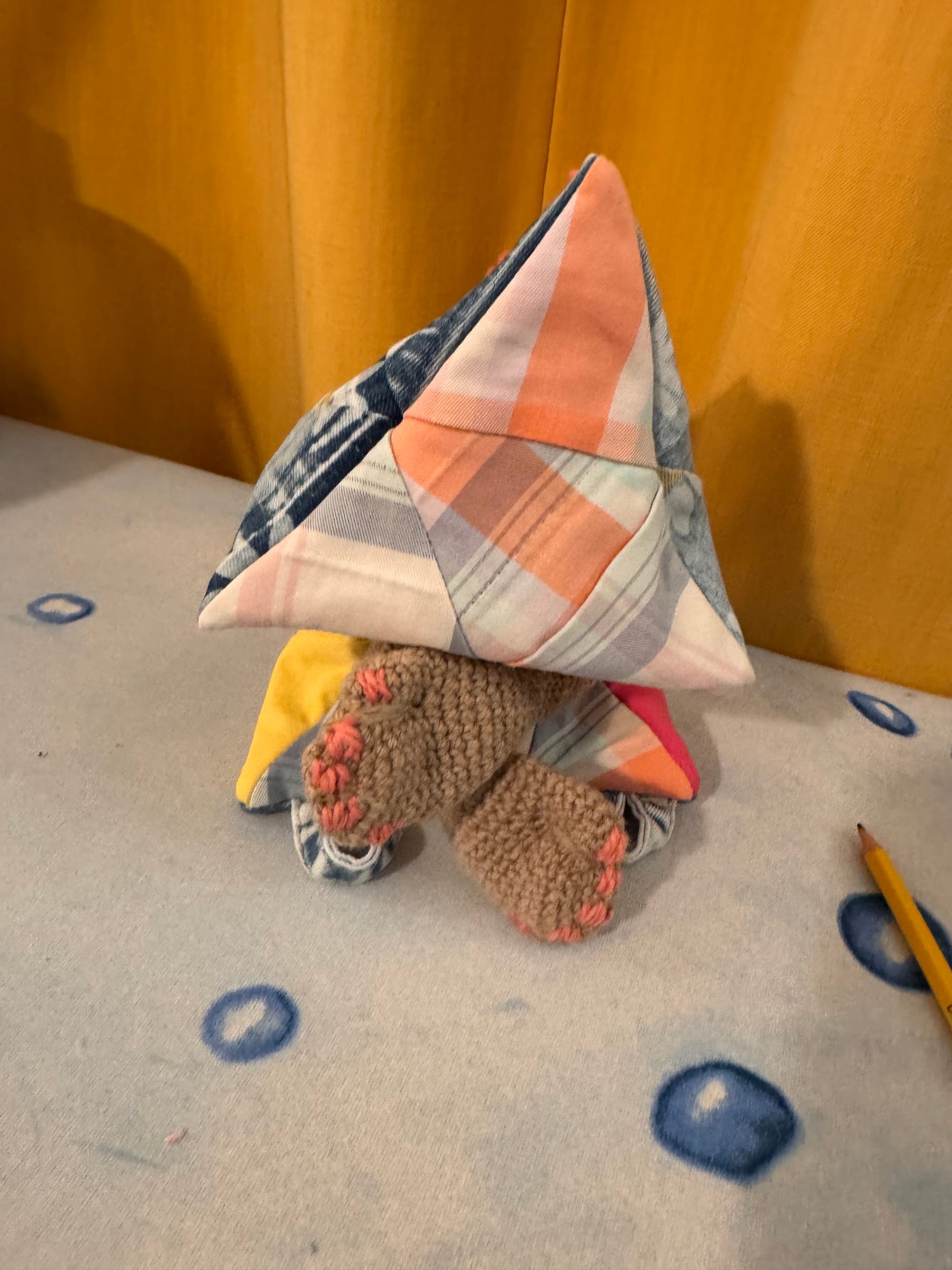 Melly has beautiful fingernails which are painted pink. Melly is a little bit overstuffed. She's been snacking on too many dragonflies. She was our first patchwork experiment, pieced together from equilateral triangles.