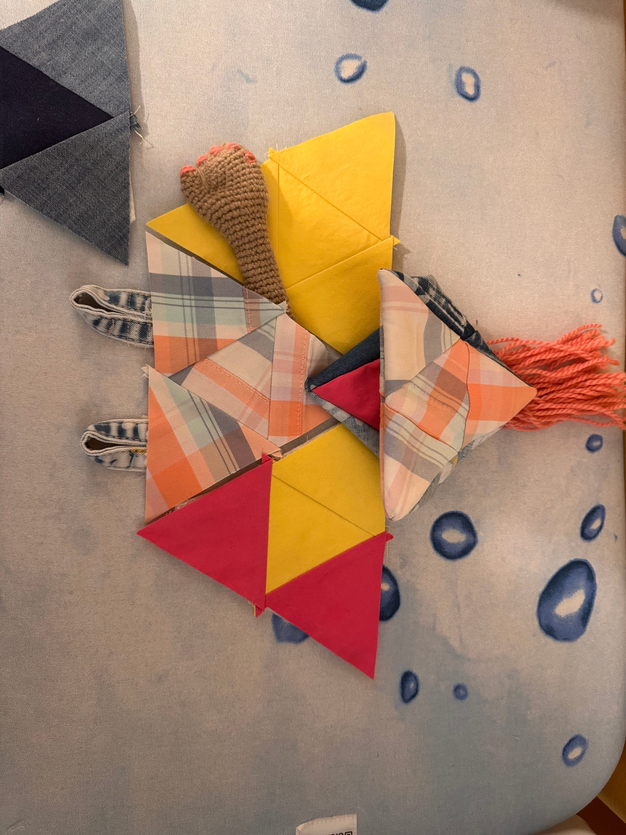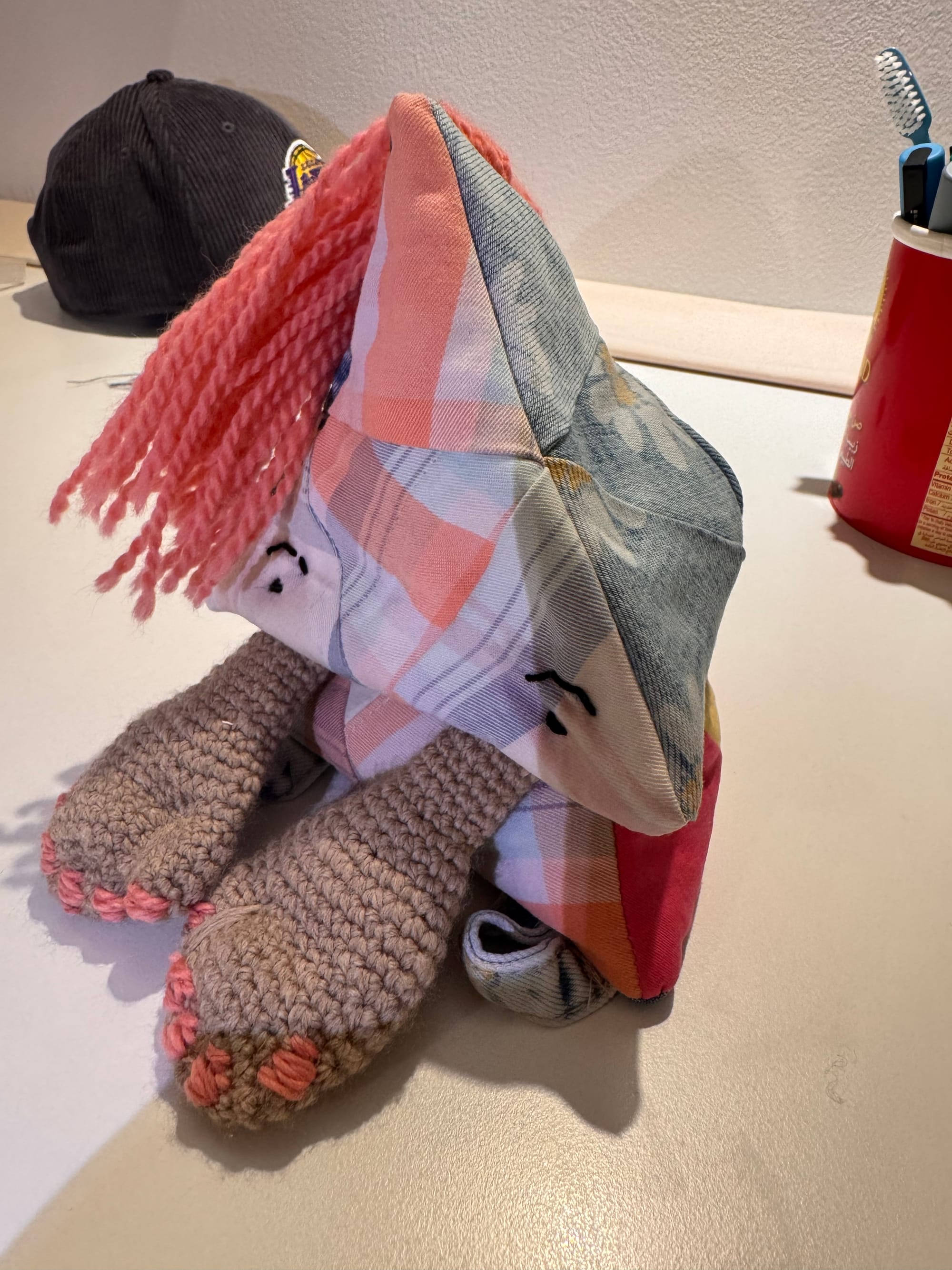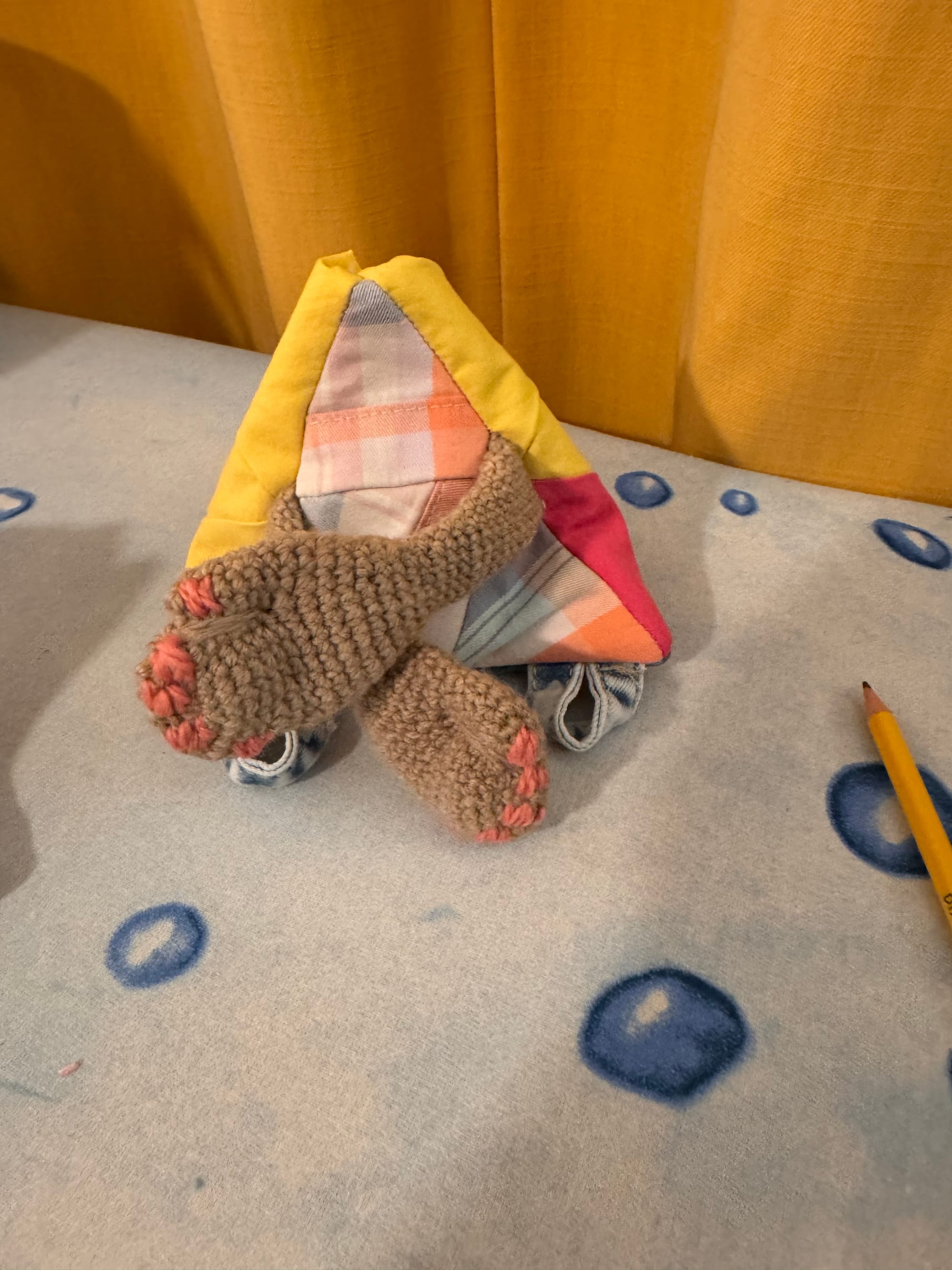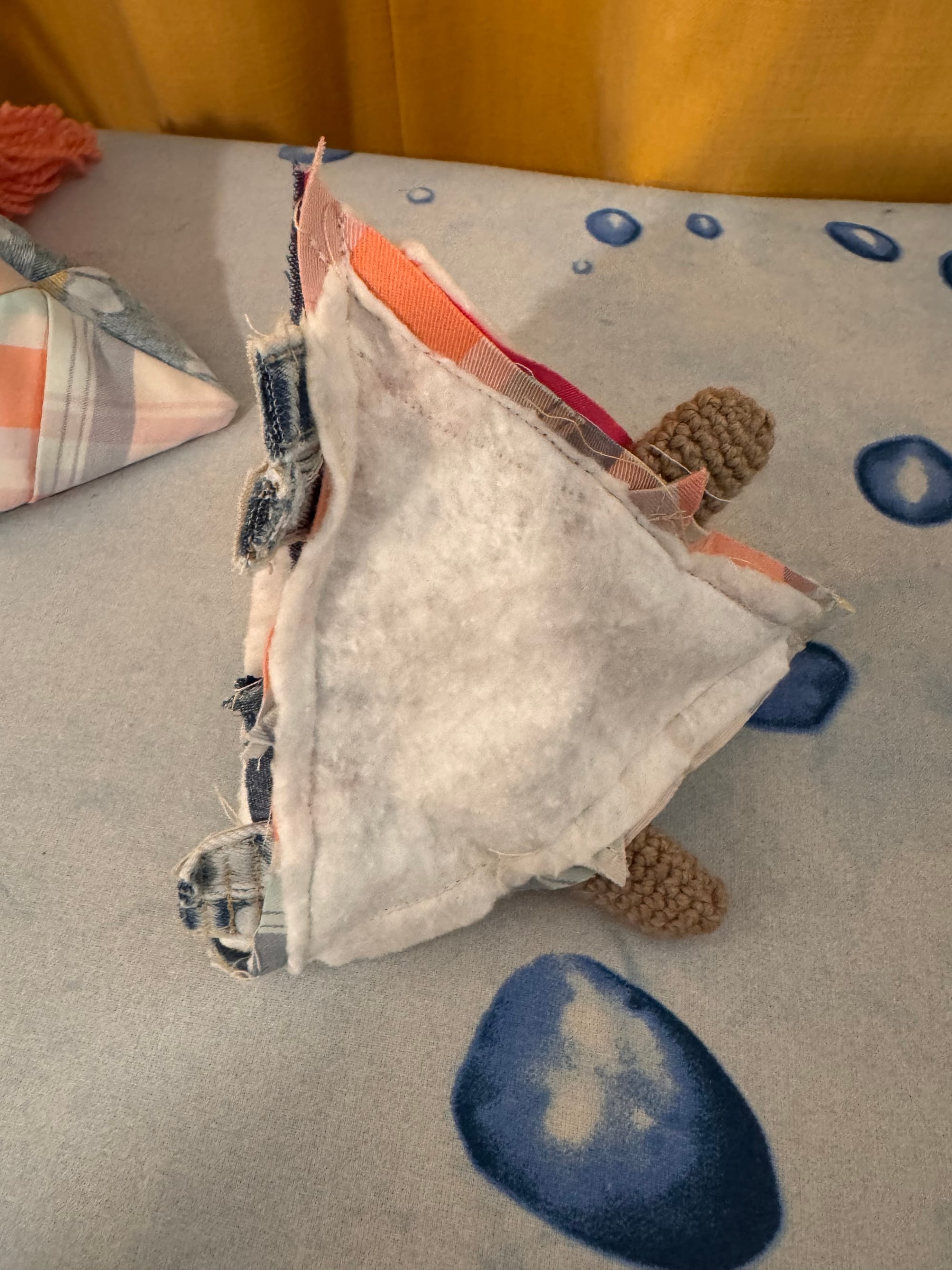 Melly has beautiful fingernails which are painted pink. Melly is a little bit overstuffed. She's been snacking on too many dragonflies. She was our first patchwork experiment, pieced together from equilateral triangles.