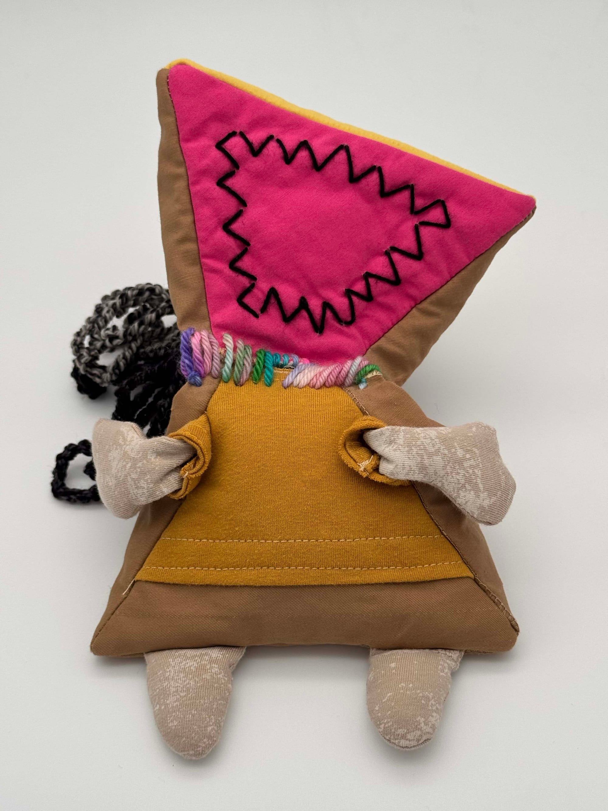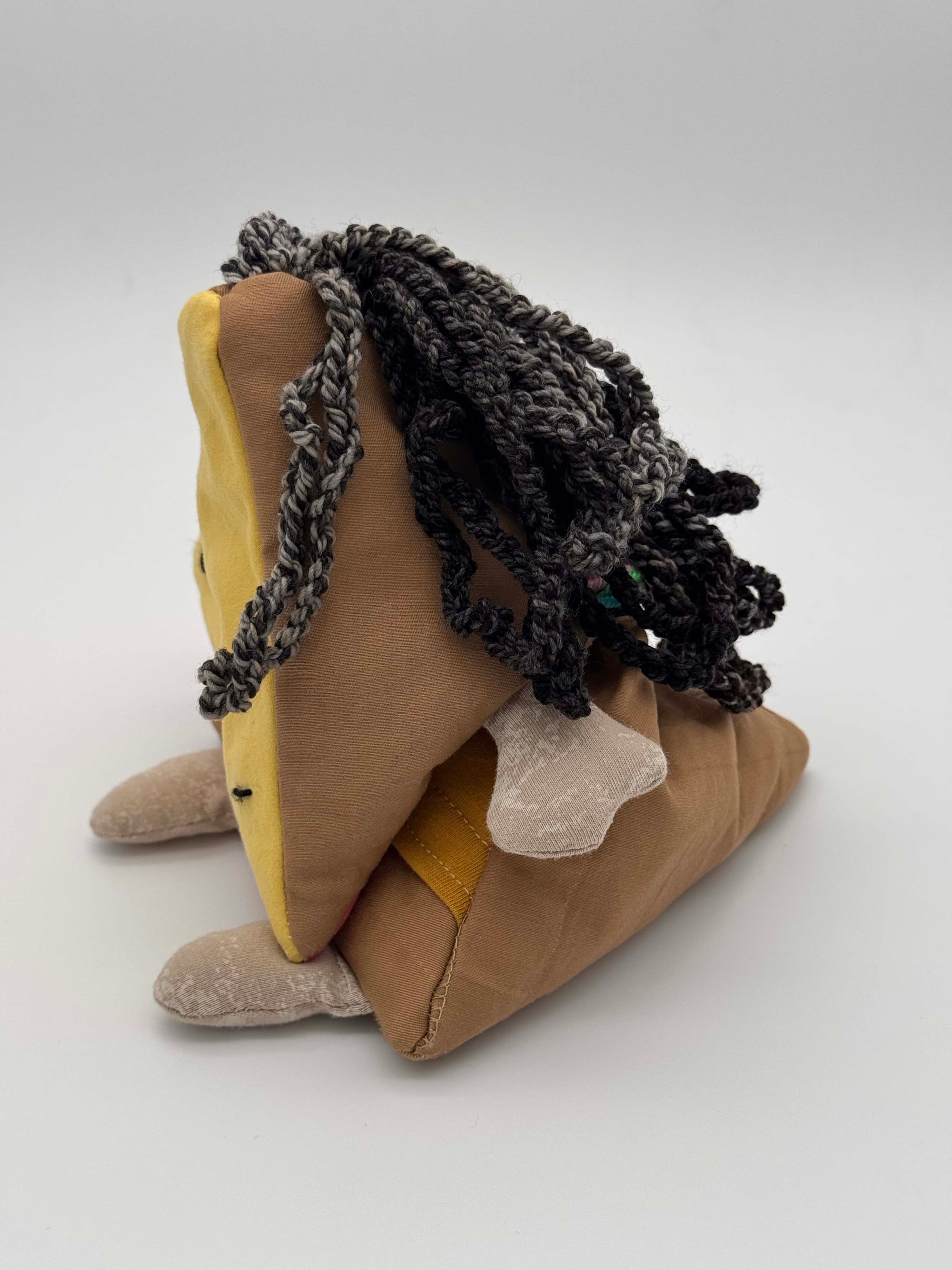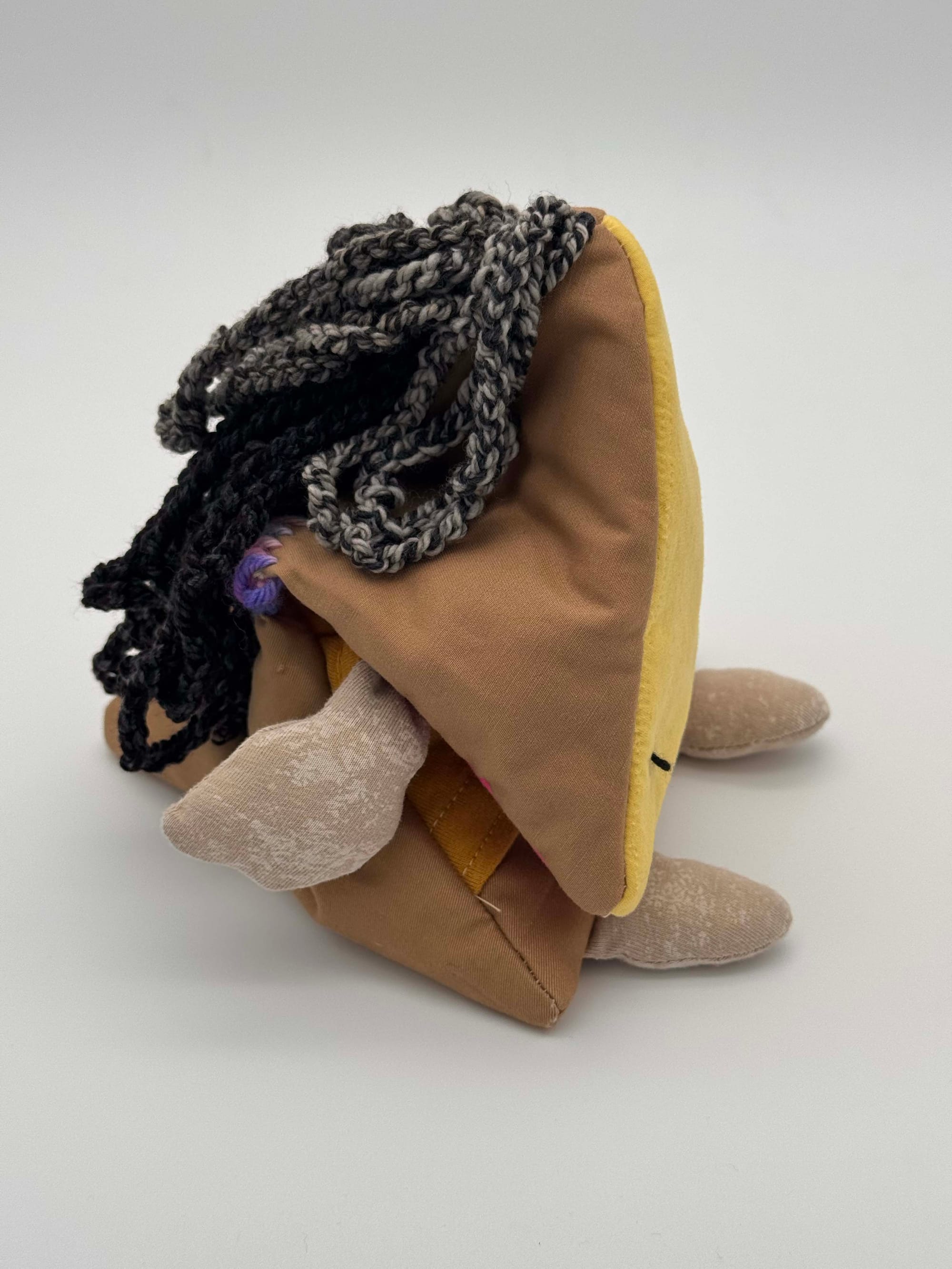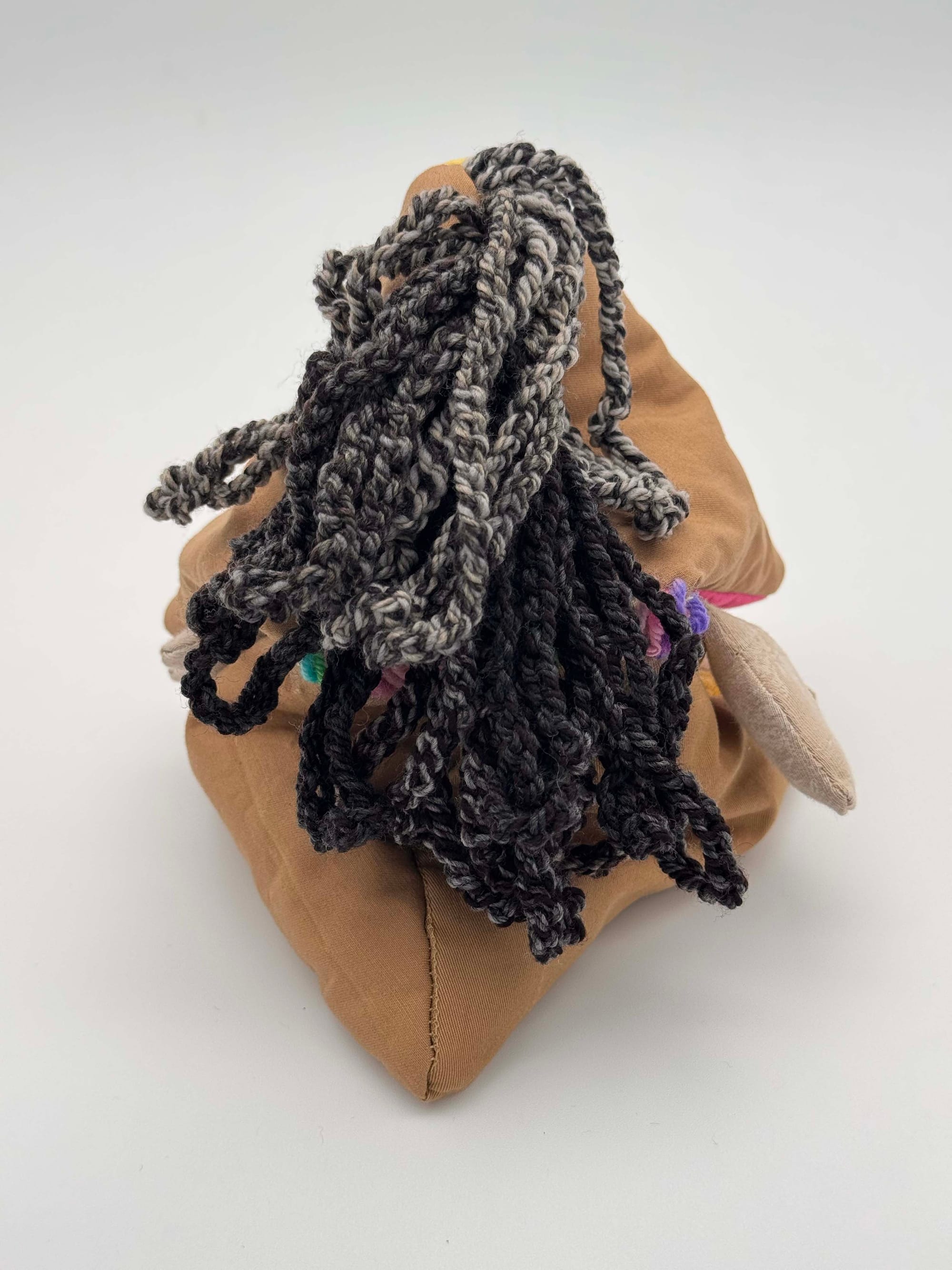 Telly is made out of an old pair of khaki pants, a scrap of yellow fabric, some thread. The most notable fibers on Telly are the hair, which is from Spin Cycle Yarns. I cannot remember the name of the colorway. I'll have to go look that up...Okay, it's called Stay Ready. That's the name of the colorway of the yarn for the hair.