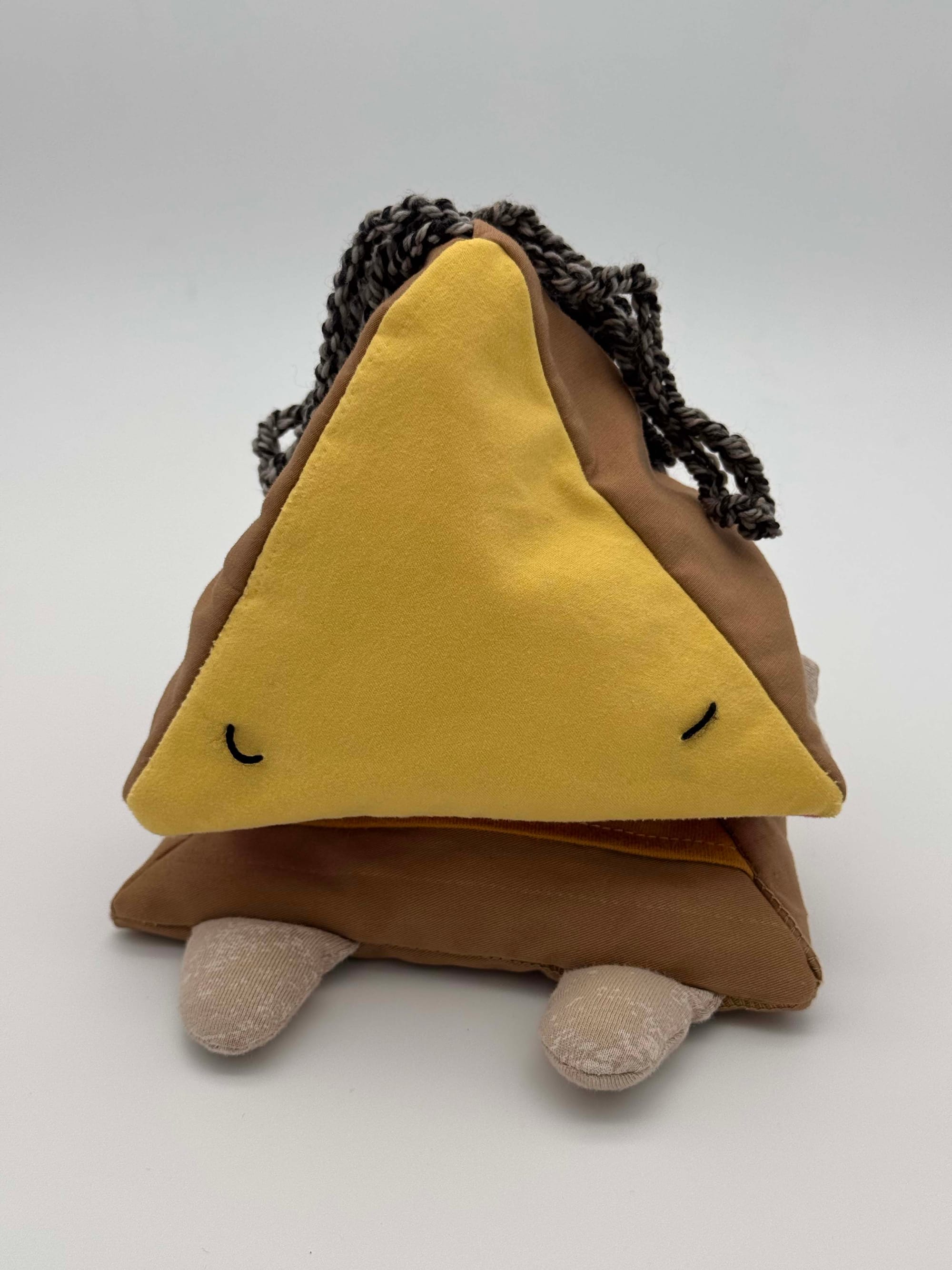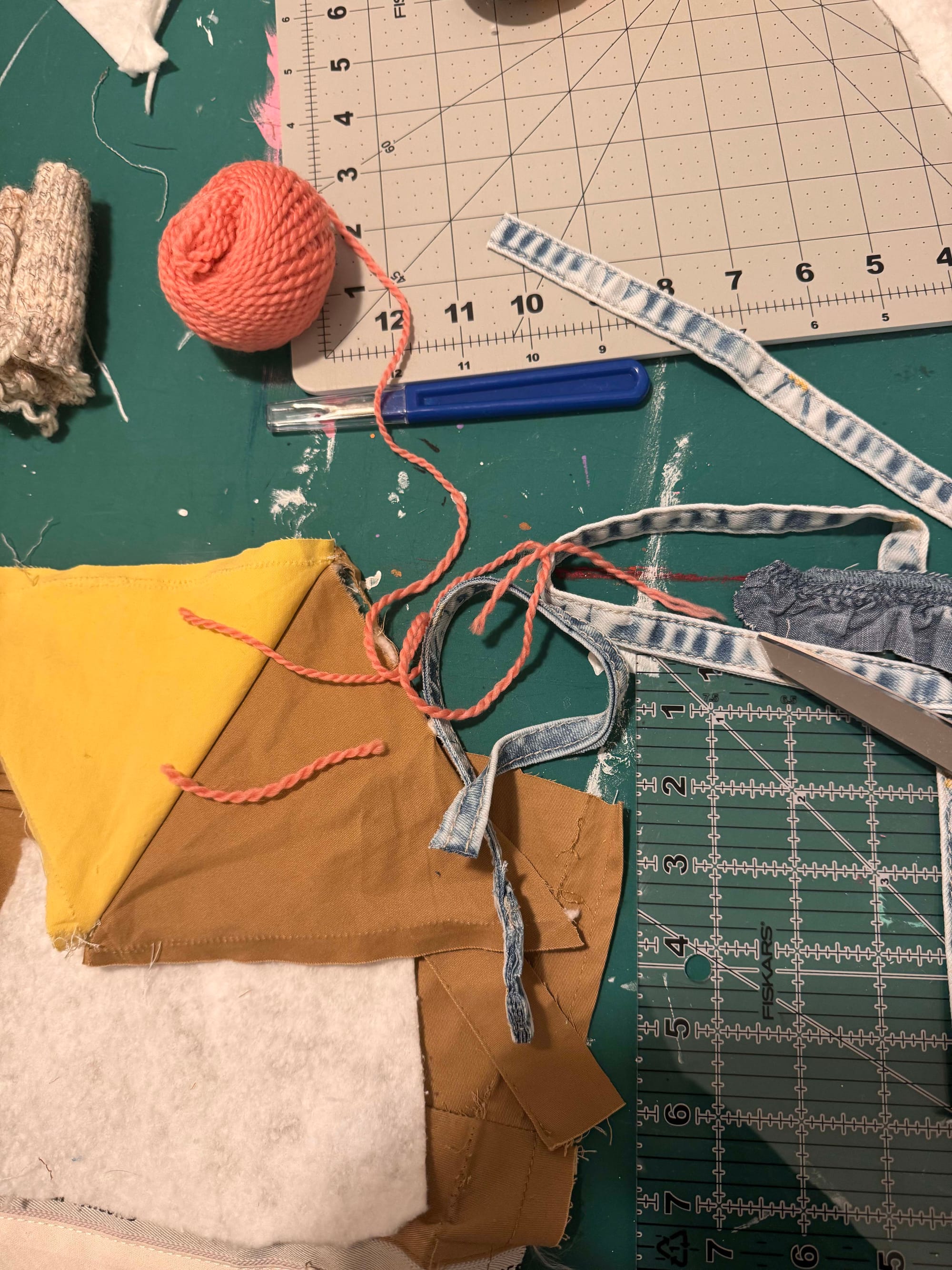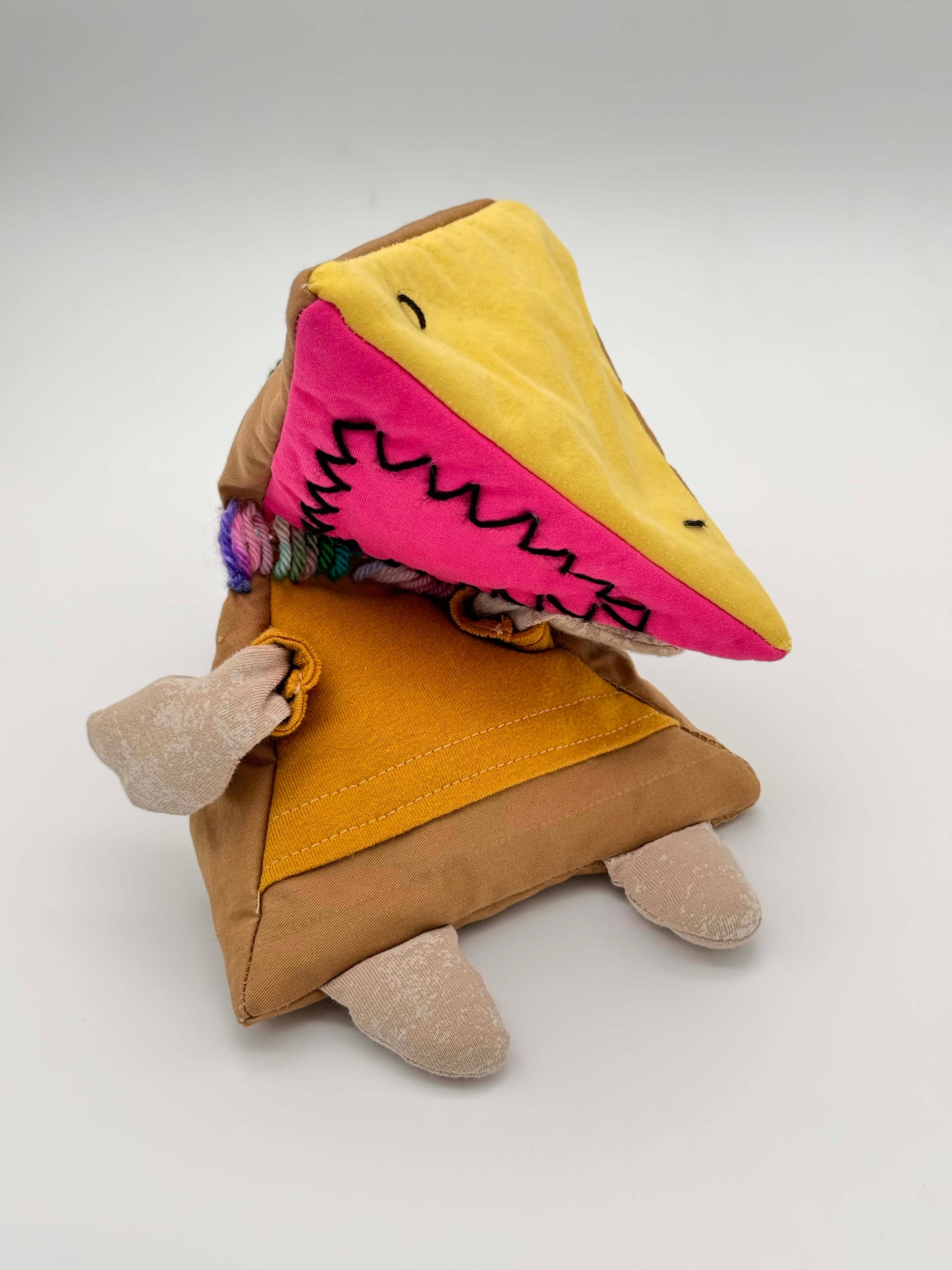 Telly is made out of an old pair of khaki pants, a scrap of yellow fabric, some thread. The most notable fibers on Telly are the hair, which is from Spin Cycle Yarns. I cannot remember the name of the colorway. I'll have to go look that up...Okay, it's called Stay Ready. That's the name of the colorway of the yarn for the hair.
