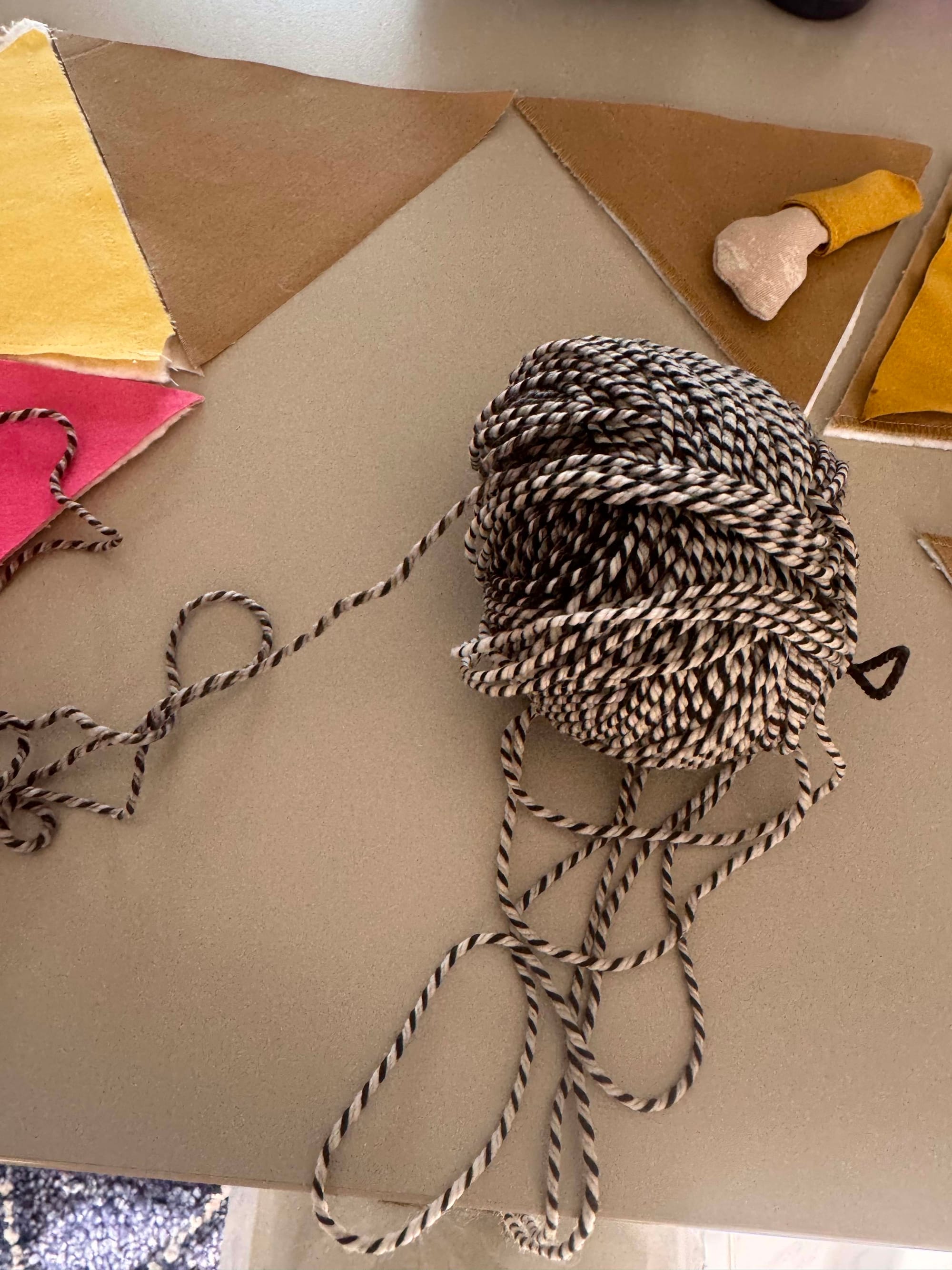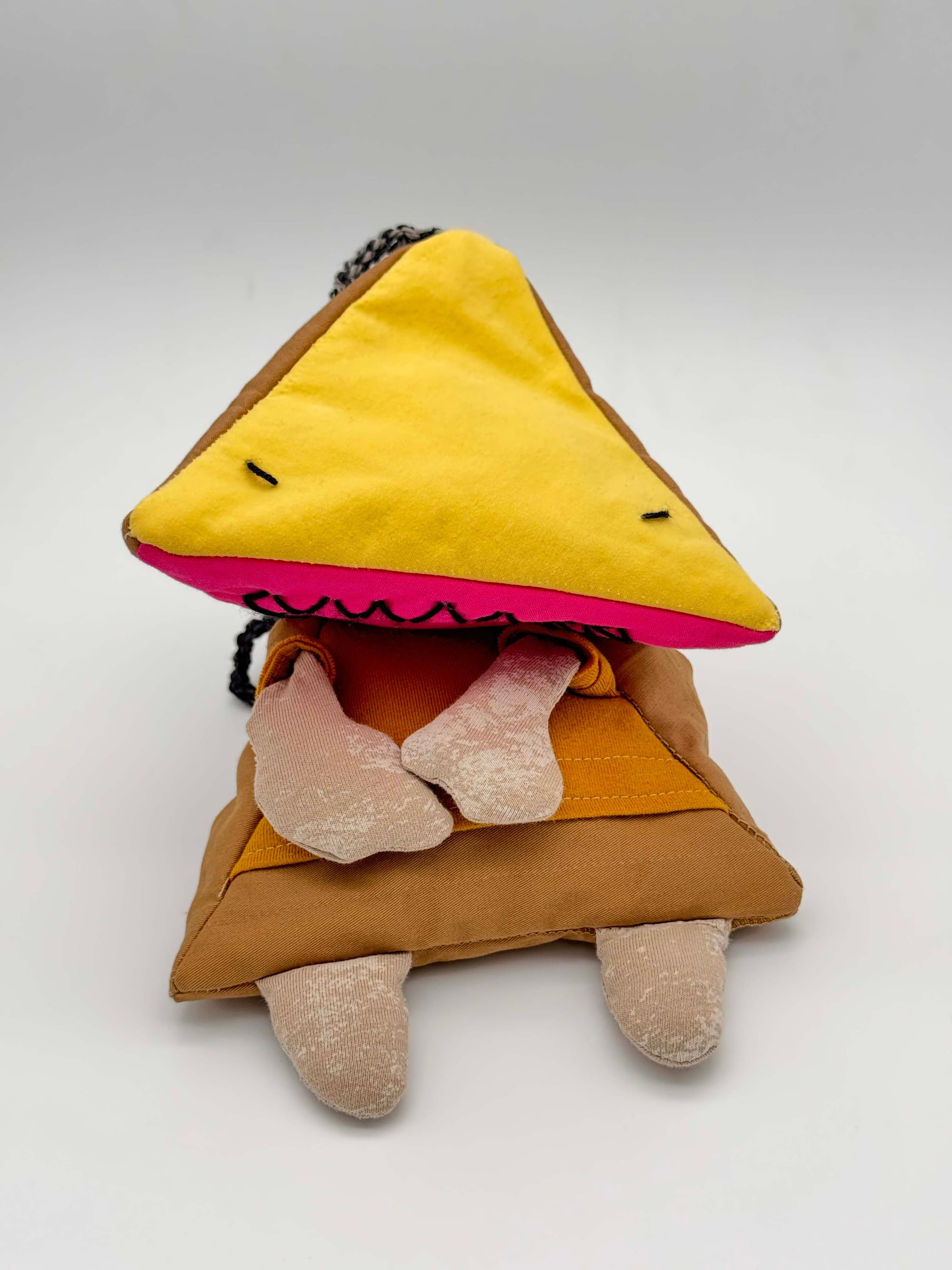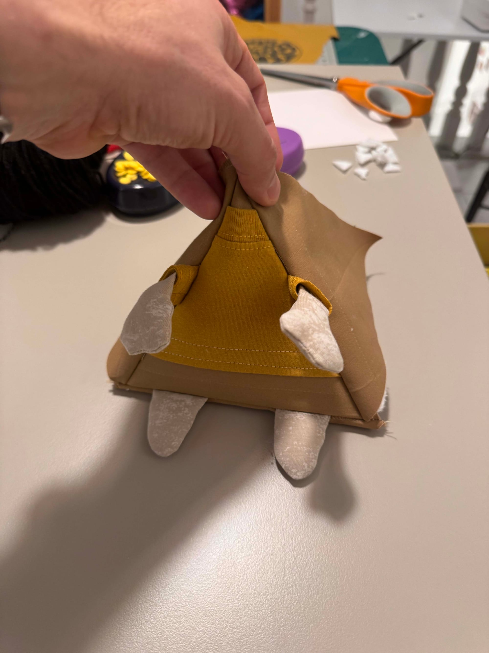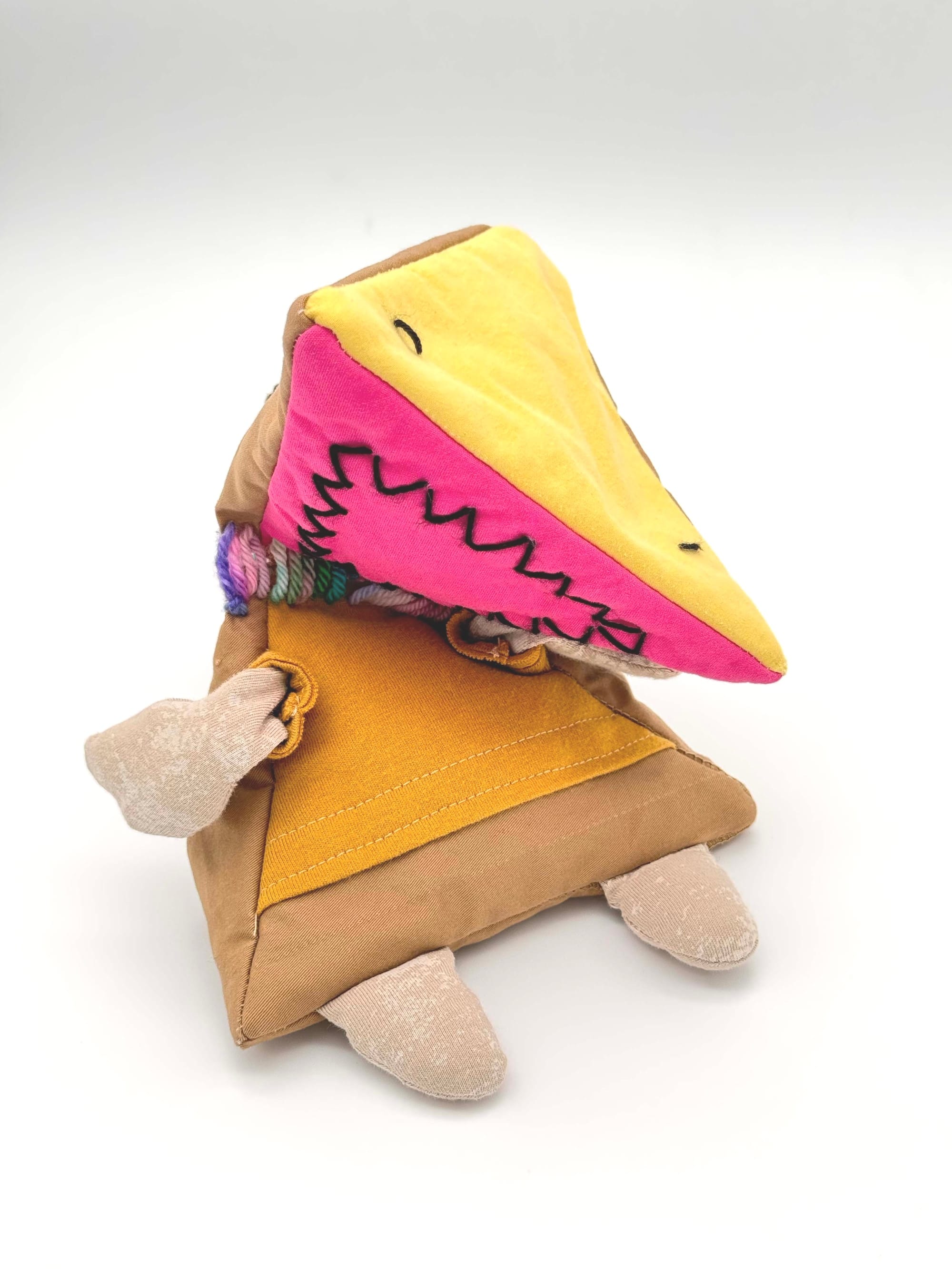 Telly is made out of an old pair of khaki pants, a scrap of yellow fabric, some thread. The most notable fibers on Telly are the hair, which is from Spin Cycle Yarns. I cannot remember the name of the colorway. I'll have to go look that up...Okay, it's called Stay Ready. That's the name of the colorway of the yarn for the hair.